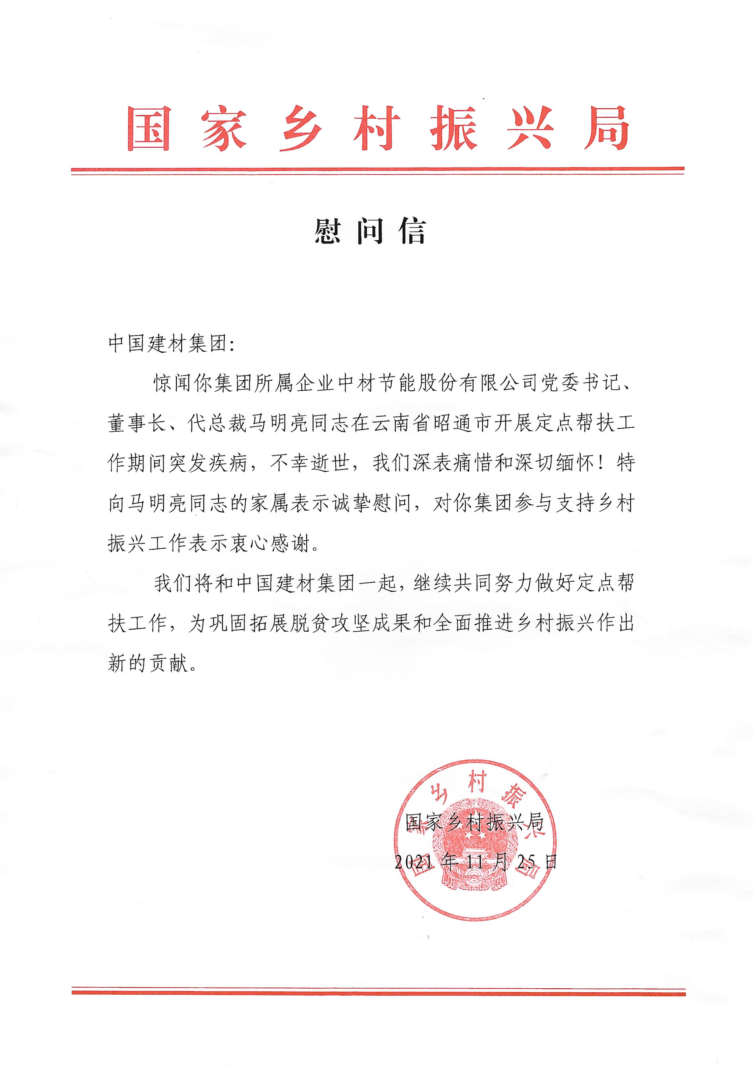 国家乡村振兴局就逝世在帮扶一线马明亮同志致beat365体育官方网站慰问信