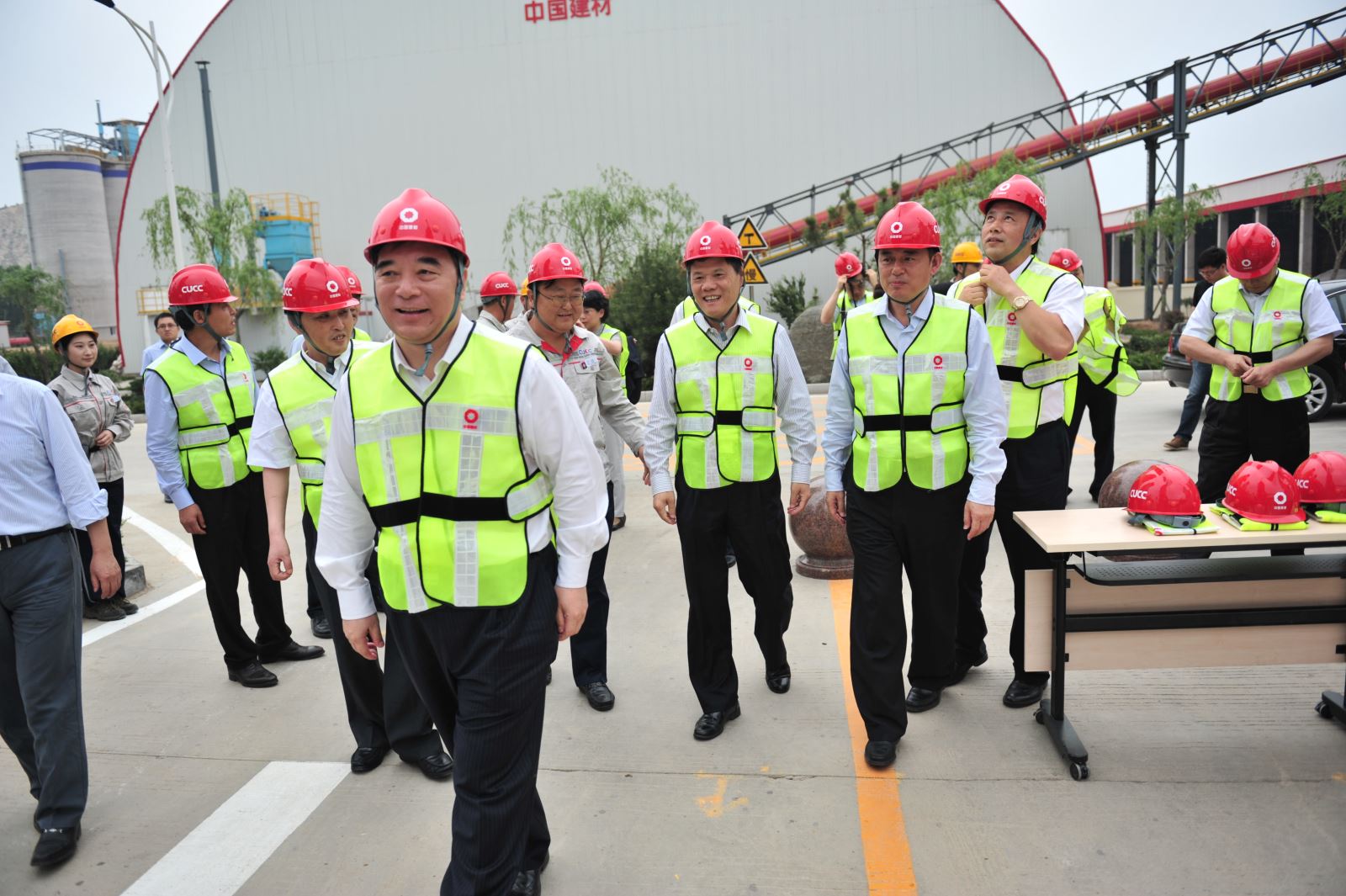 宋志平一行在泰安中联参观考察了低能耗日产5000吨新型干法熟料示范线。该线的电耗、热耗、自动控制、缩短水泥制造流程等技术指标达到了世界领先水平,是水泥行业的标杆生产线。该线具有矿山开采智能化、原料处理无均化、生产管理信息化、生产控制自动化、耐火材料无铬化、物料粉磨无球化、生产现场无人化、生产过程可视化等特点,建立了矿山开采三维数据库、GPS调度指挥系统、在线分析控制系统,缩短了工艺流程。