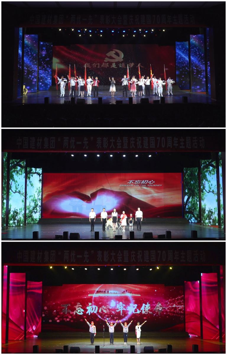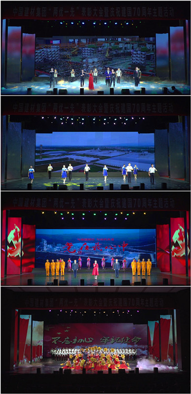 在庆祝中华人民共和国成立70周年主题活动上,来自集团11家成员企业的干部员工分为传承、责任、奉献、奋斗四个篇章,以演说、合唱、舞蹈、快板、情景剧、舞台剧等多种形式,或激情澎湃、或感人至深、或娓娓道来,呈现了一场振奋人心、鼓舞士气的精神盛宴,一次次赢得现场雷鸣般的掌声。北新建材的《初心向党耀北新 砥砺奋进谱新篇》、凯盛科技的《伟大跨越中的凯盛之路》,回顾了中国建材人不忘初心、砥砺前行,大力发展新型建材和玻璃工业的光辉历程;中联水泥的《最美的蓝天 最美的你》、天山水泥的《敢问谁人无芳华 我自不悔驻村行》、南方水泥的《梦想启航南方》,讲述了中国建材人积极贯彻落实党中央决策部署,勇做美丽中国的推动者、脱贫攻坚的践行者和供给侧结构性改革的引领者的动人故事;中国建材总院的《我们都是追梦人》、地勘江苏总队的《誓言无声》、北新集团的《我的房屋梦》,诠释了中国建材人坚守奉献、实干担当的坚定信念和无悔追求;中国巨石的《逐梦奋进再出发》、泰山玻纤的《泰山玻纤 玻纤泰山》、中材国际南京的《党在我心中——与祖国同行 与时代共进》、凯盛科技的《不忘初心》展现了中国建材人不忘初心、牢记使命、永远奋斗的最美姿态。活动在全场齐声高唱《歌唱祖国》的歌声中圆满落幕。