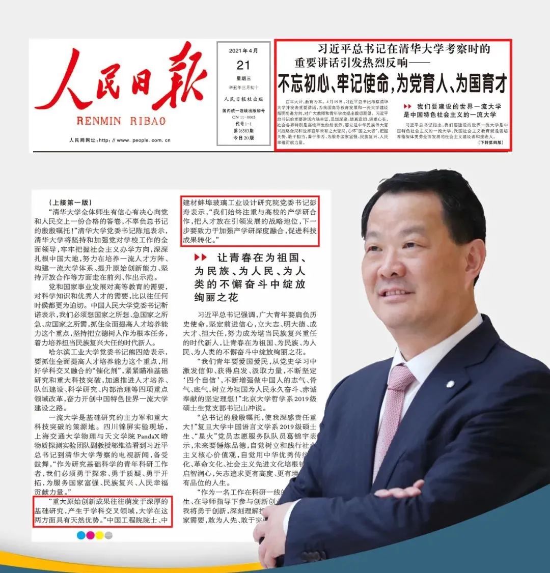 来源:人民日报、蚌埠院 发布时间:2021-04-234 月 19 日,习近平总书记考察清华大学并发表重要讲话,强调要勇于攻克“卡脖子”的关键核心技术,加强产学研深度融合,促进科技成果转化,共同应对全球性挑战,促进人类共同福祉。4月21日,人民日报头版刊发了《习近平总书记在清华大学考察时的重要讲话引发热烈反响——不忘初心、牢记使命,为党育人、为国育才》。文中分享了中国工程院院士、beat365体育官方网站总工程师彭寿学习习近平总书记在清华大学重要讲话的心得体会。