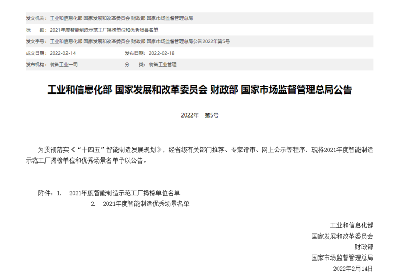 集团企业1家揭榜2021年度智能制造示范工厂,6家入选智能制造优秀场景