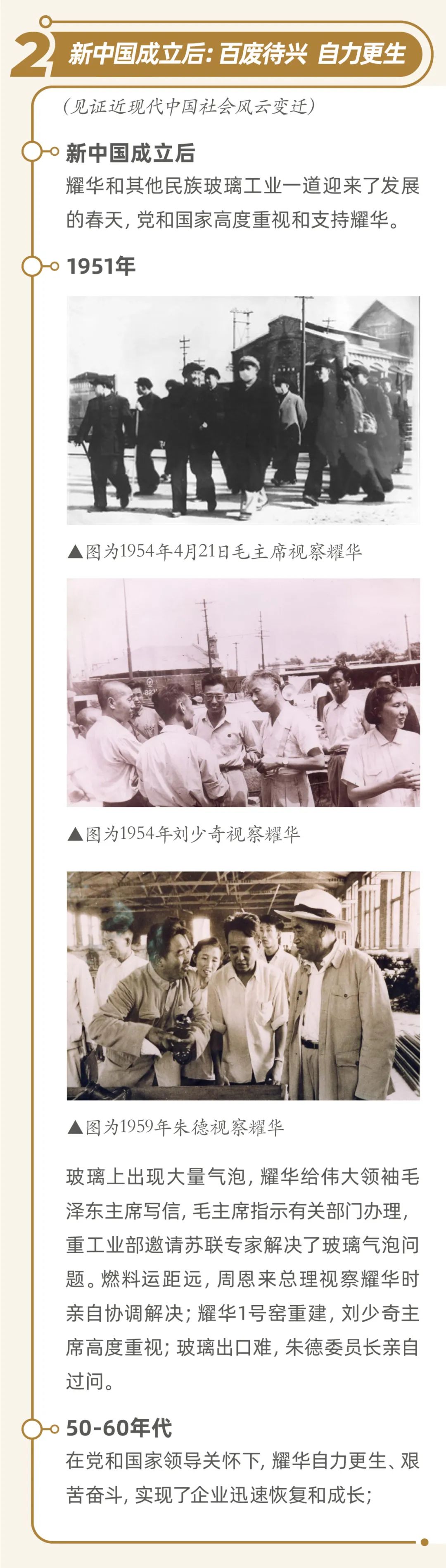 新中国成立之初,百废待兴的新中国建设急需大量的玻璃产品,我国的平板玻璃工业和科研院所如雨后春笋般迅速发展起来。这一时期,耀华受到了国家的关注与支持,进入国营企业,第一次以主人翁的姿态投身到热火朝天的生产之中,为共和国建设发展和振兴作出了突出贡献。