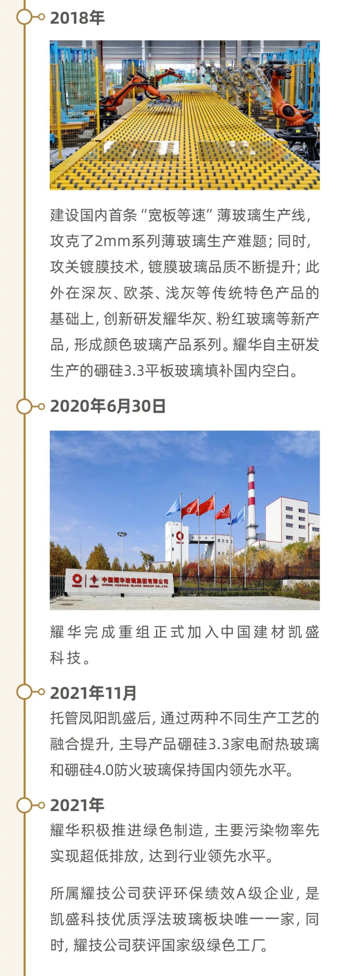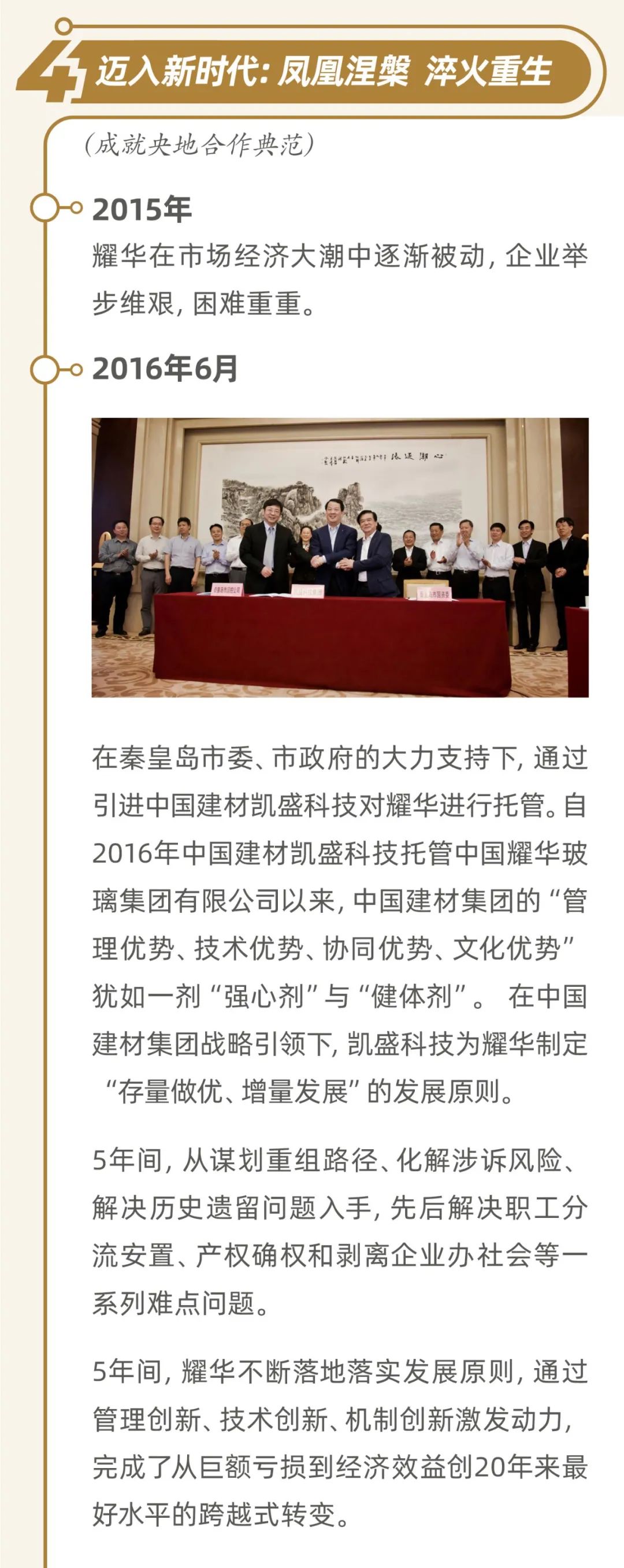 2015年以来,耀华在市场经济大潮中逐渐被动,为帮助耀华走出困境,beat365体育官方网站和凯盛科技承担起了这个历史重任。2020年6月30日,耀华完成重组正式加入中国建材凯盛科技。由此,耀华驶入高质量发展快车道,百年企业重新焕发出生机和活力,成为央地合作的典范。