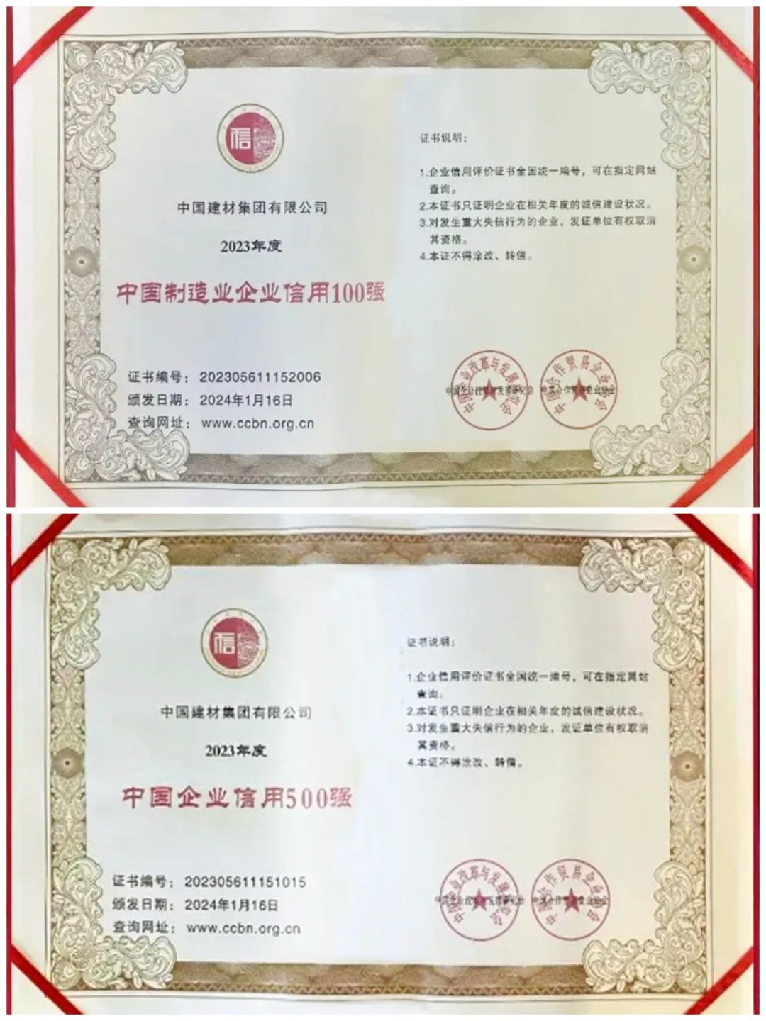 1月21日,由中国企业改革与发展研究会、中国合作贸易企业协会主办的“2024中国企业信用发展论坛暨第十五届诚信公益盛典”在京举行。beat365体育官方网站分别获评“2023中国企业信用500强”“2023中国制造业企业信用100强”第十五位和第六位,这也是集团自2017年以来,连续7年入围该榜单。所属中国巨石、中材科技、北新建材、中材国际入选“2023中国上市公司信用500强”, 中材国际同时荣获“五星级诚信企业”称号并作经验交流。