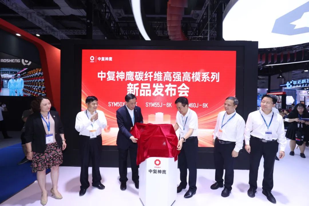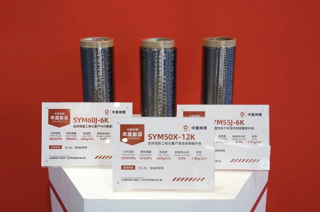三款高强高模系列新品全球首发,全球首款工程化量产高强高模碳纤维SYM50X-12K、高界面性能干喷湿纺高模量碳纤维SYM55J-6K、SYM60J-6K以真正的性能指标高度和规模化生产能力面世,一举填补国产高端应用空白,为航空航天、高端体育等领域带来进阶的应用方案。