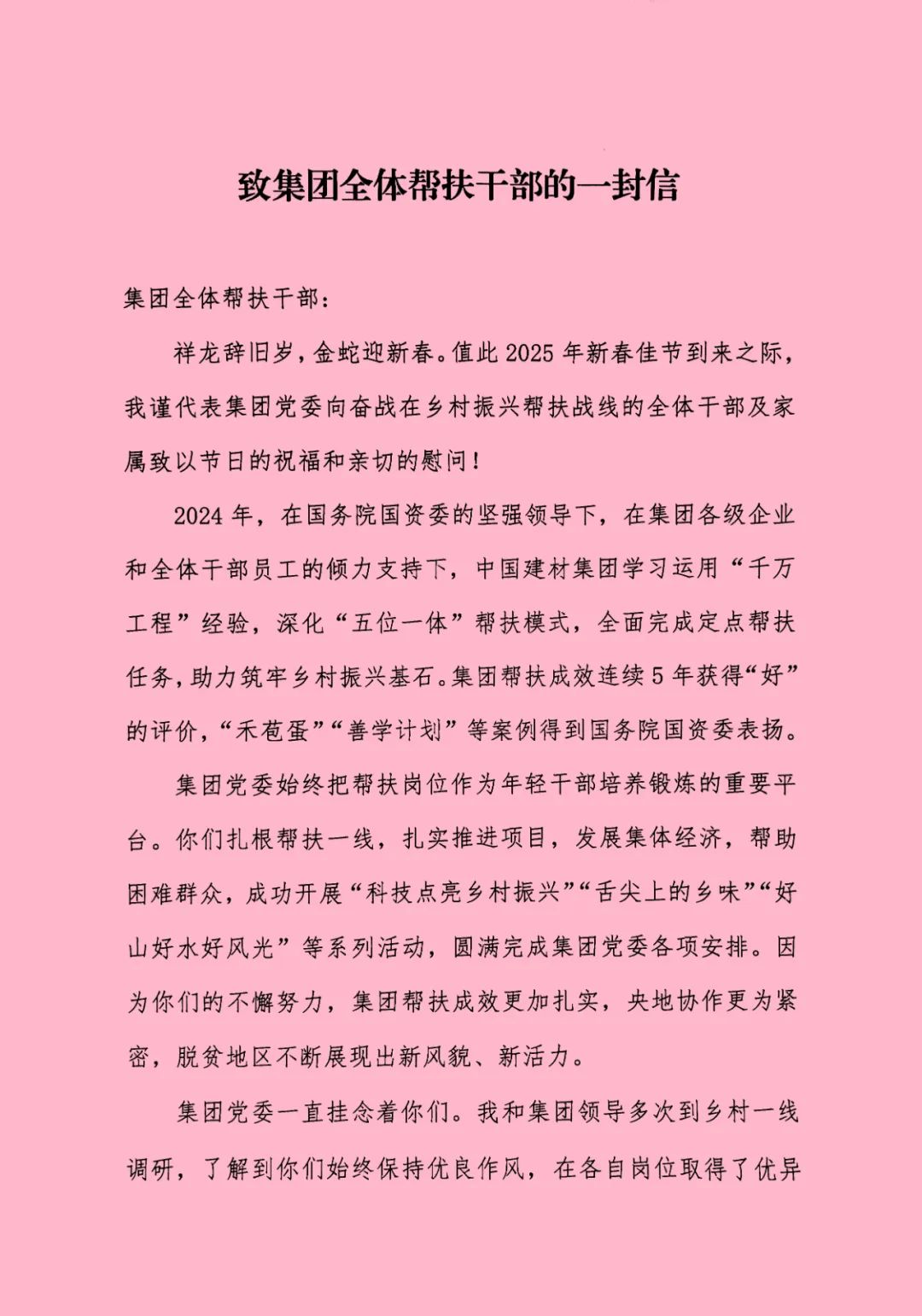 祥龙辞旧岁,金蛇迎新春。值此2025年新春佳节到来之际,我谨代表集团党委向奋战在乡村振兴帮扶战线的全体干部及家属致以节日的祝福和亲切的慰问!