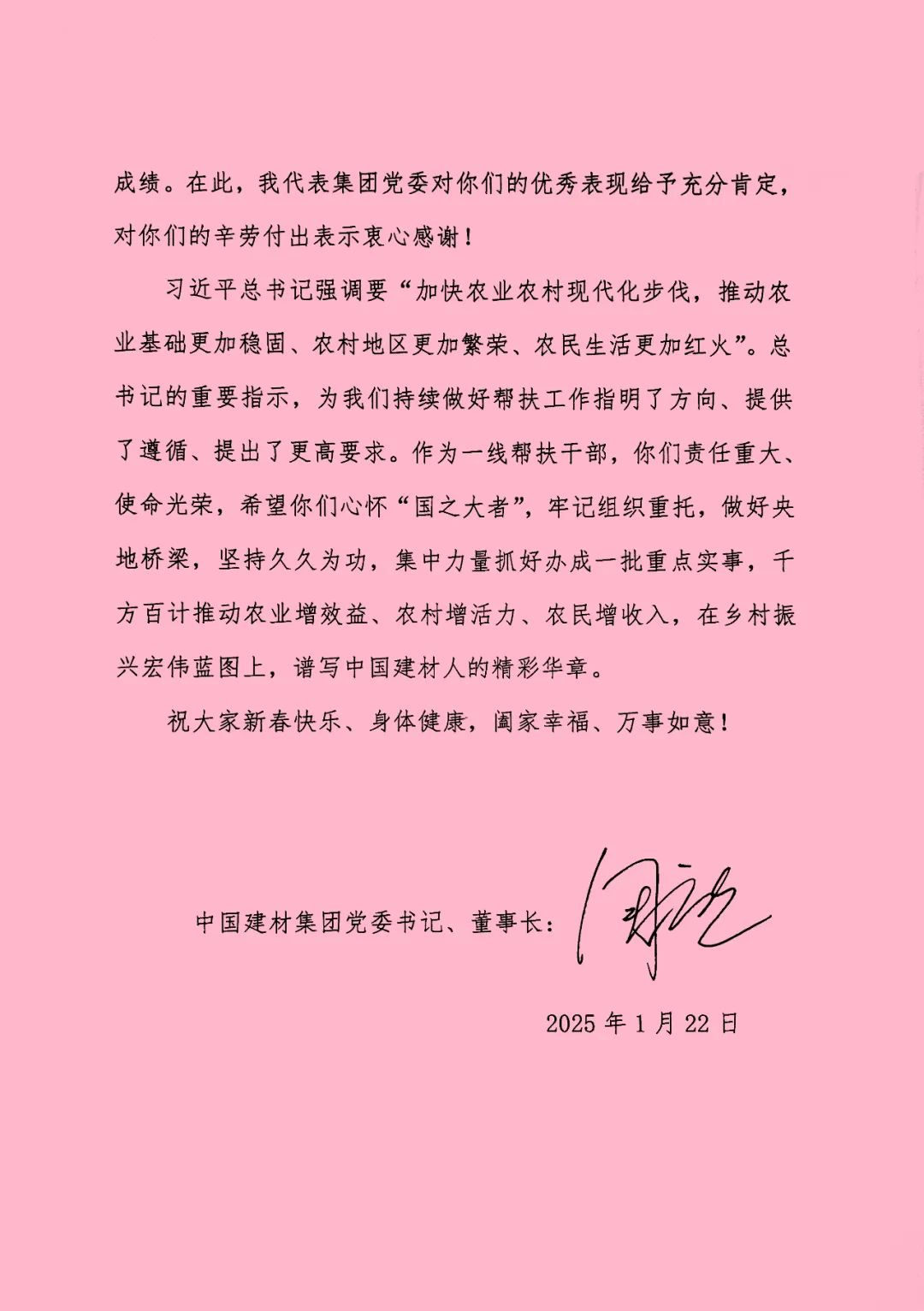 习近平总书记强调要“加快农业农村现代化步伐,推动农业基础更加稳固、农村地区更加繁荣、农民生活更加红火”。总书记的重要指示,为我们持续做好帮扶工作指明了方向、提供了遵循、提出了更高要求。作为一线帮扶干部,你们责任重大、使命光荣,希望你们心怀“国之大者”,牢记组织重托,做好央地桥梁,坚持久久为功,集中力量抓好办成一批重点实事,千方百计推动农业增效益、农村增活力、农民增收入,在乡村振兴宏伟蓝图上,谱写中国建材人的精彩华章。