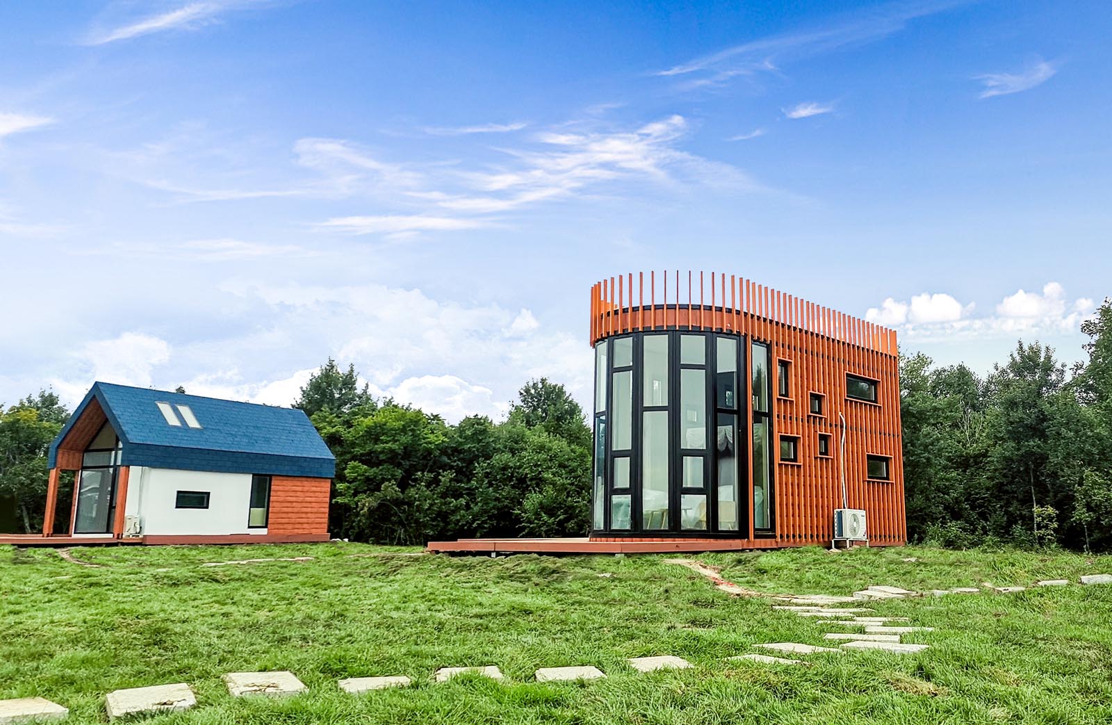 十几栋用装配式建筑建成的汽车营房错落有致地分布在黑龙江畔,彼此相隔适当距离,保留隐私。红墙灰瓦的房子,与蓝天碧草交相辉映,风景如画。偌大的落地窗为室内带来极好的采光,更衔接了室内空间与外部环境,使人全身心地享受自然之趣。