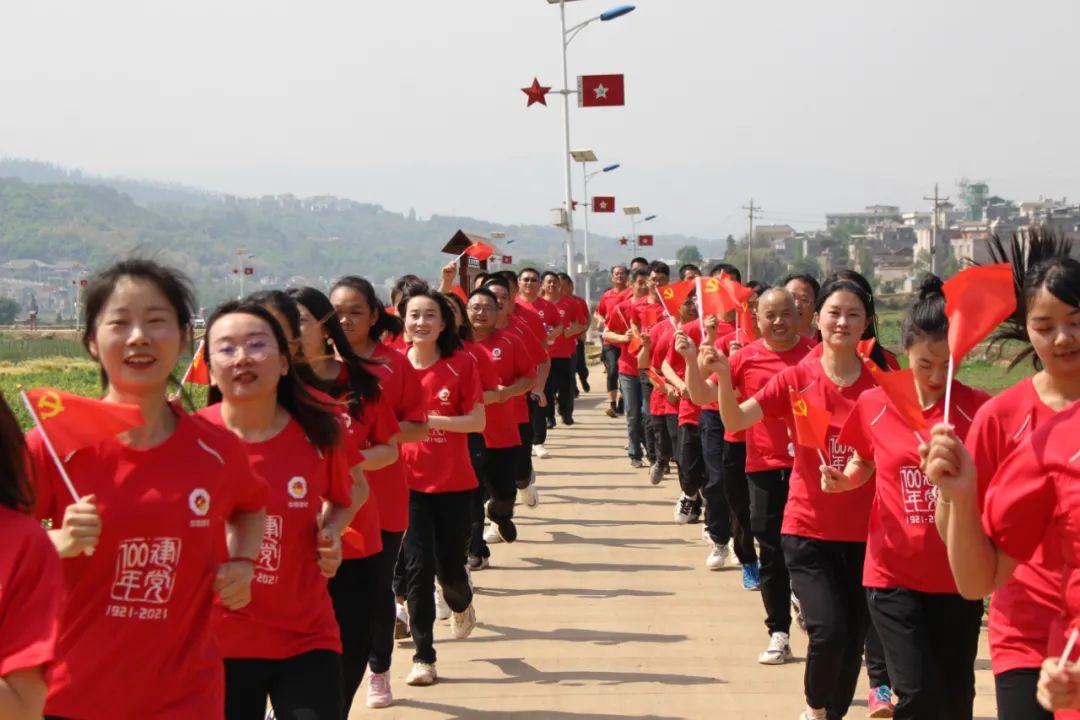 本次健跑全程7.1公里,寓意党的生日,其中沿线健跑“长征路”2.5公里,寓意二万五千里长征。健跑路线沿线设置四个标识牌,分别为:1921-1949(新民主主义革命时期),1949-1978(社会主义革命和建设时期),1978-2012(改革开放和社会主义现代化建设时期),2012-2021(中国特色社会主义新时代),寓意中国共产党1921年到2021年的百年光辉历程。随着开跑号令,大家在四名擎旗手的带领下,如离弦之箭冲出起点、踏上征程。一路上,大家相互鼓劲,所有人员无一退缩,均跑到了终点,充分体现了“团结精进、不胜不休”的长征精神。