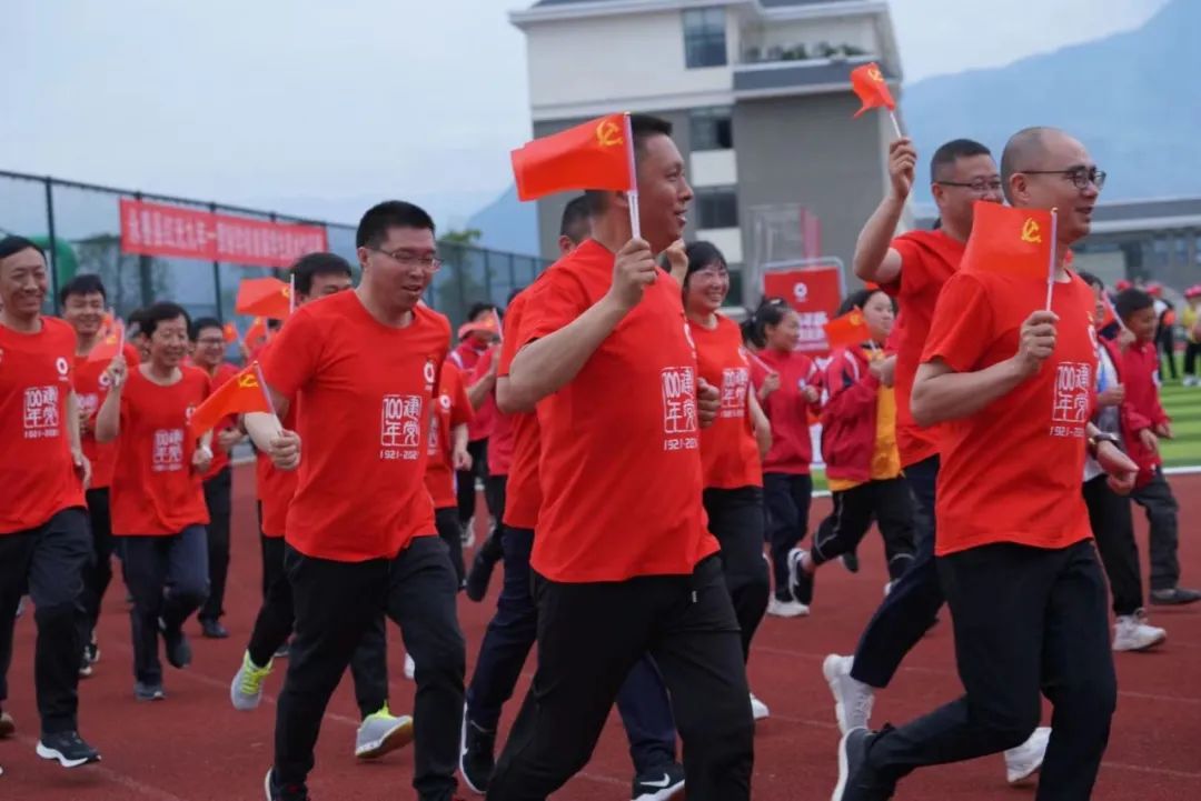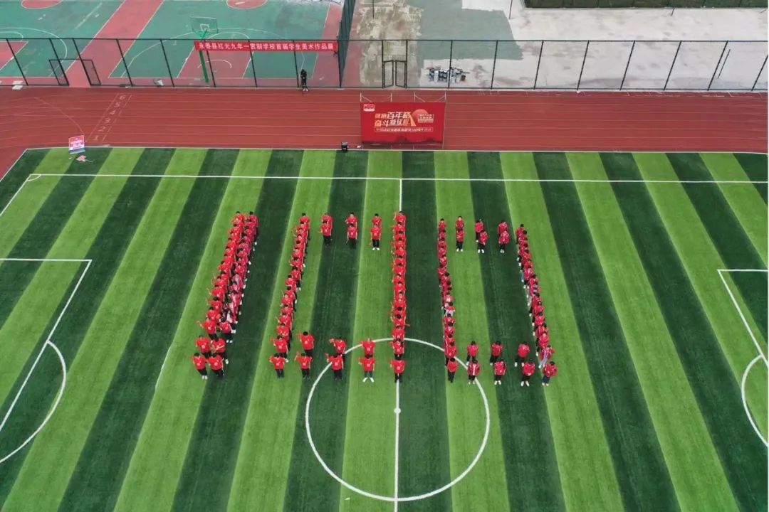 最后,全体党员职工与学校学生共同有序排列成“100”“7.1”字样队形,挥舞党旗,高喊“健跑百年路、奋斗新征程”主题,热烈庆祝中国共产党成立100周年。