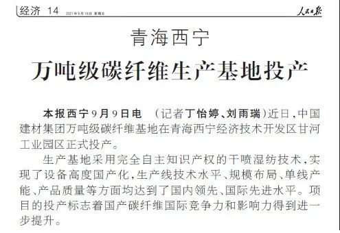 人民日报今日刊登万吨碳纤维基地投产截图