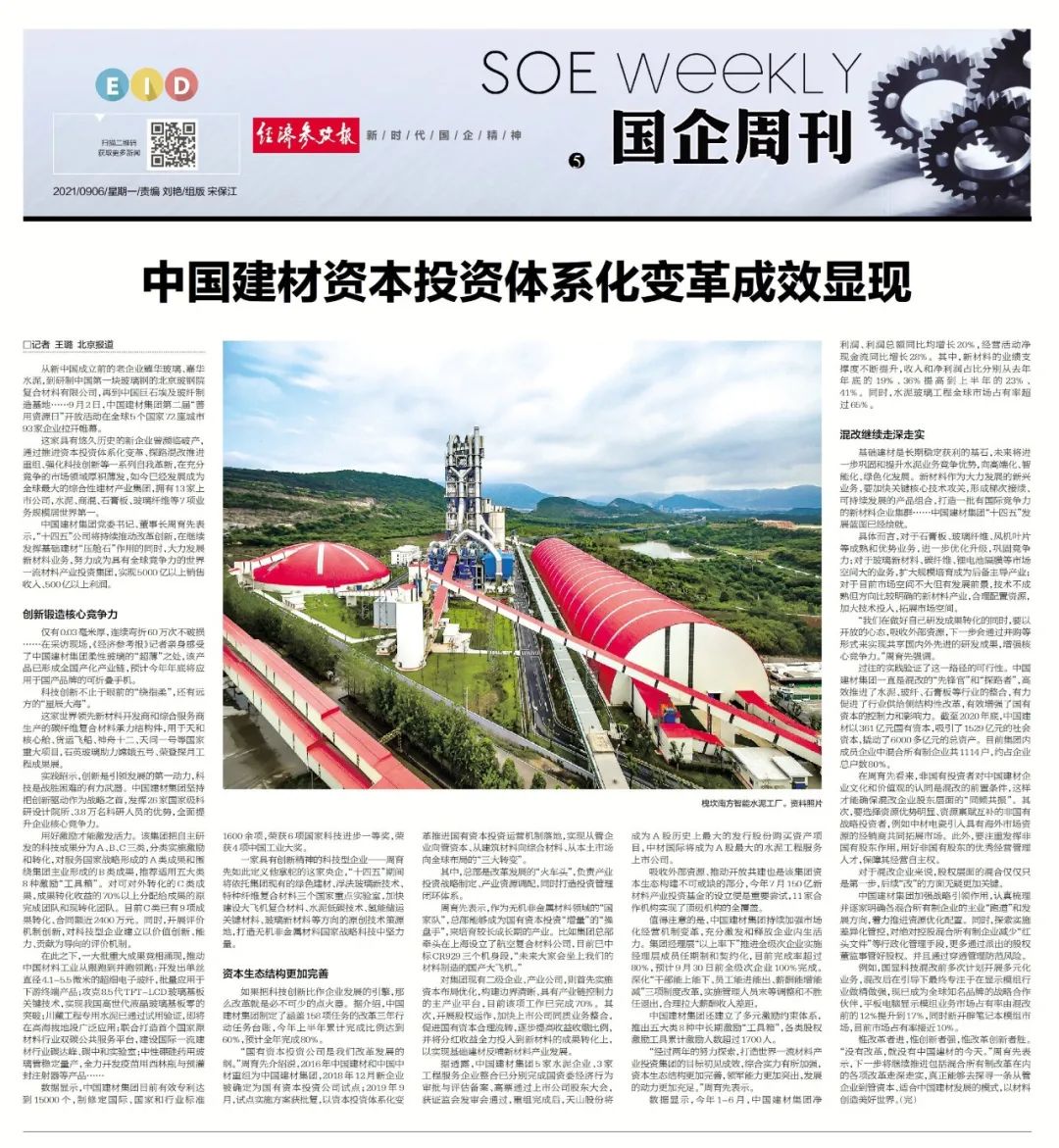 经济参考报专稿《中国建材资本投资体系化变革成效显现》侧重报道了柔性玻璃、石英玻璃、碳纤维复合材料承力结构件等新材料产品应用于神舟十二号、天问一号等国家工程,强调beat365体育官方网站正在运用强大的科研能力,创新锻造企业核心竞争力。同时,持续加强市场化经营机制变革,推进混合所有制改革,探索从管企业到管资本、适合中国建材发展的新模式。