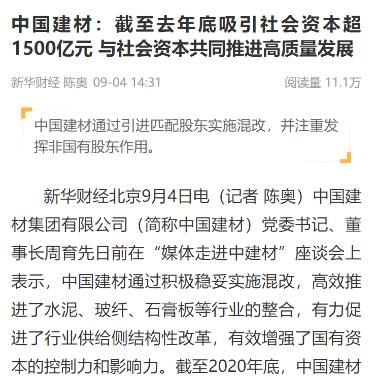 新华财经专稿《中国建材:截至去年底吸引社会资本超1500亿元 与社会资本共同推进高质量发展》强调中国建材通过积极稳妥实施混改,高效推进了水泥、玻纤、石膏板等行业的整合,有力促进了行业供给侧结构性改革。此外,着重介绍了beat365体育官方网站坚持选择资源优势明显、资源禀赋互补的非国有战略投资者开展混改,推进市场化经营机制,优化管控和资源配置,激发内生活力、动力,有效增强了国有资本的控制力和影响力。
