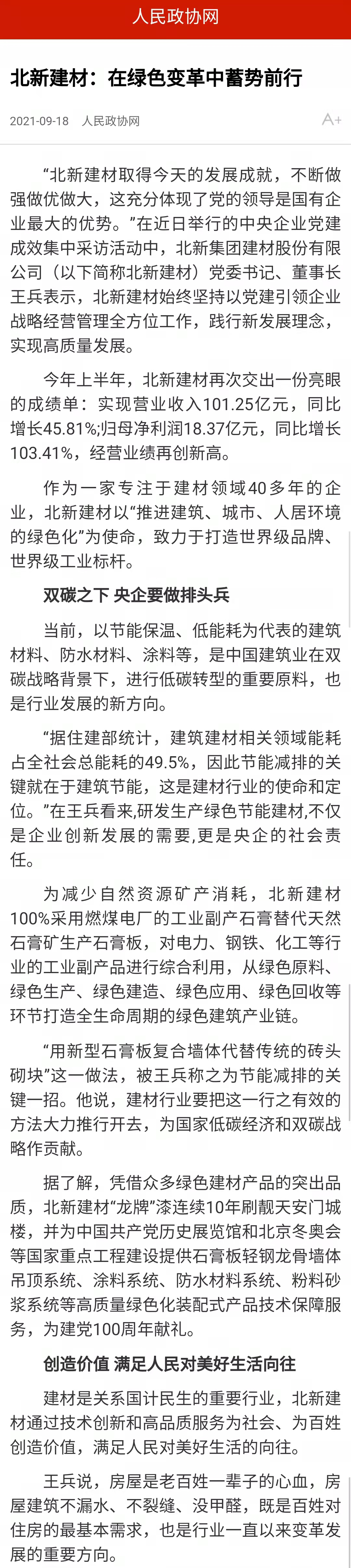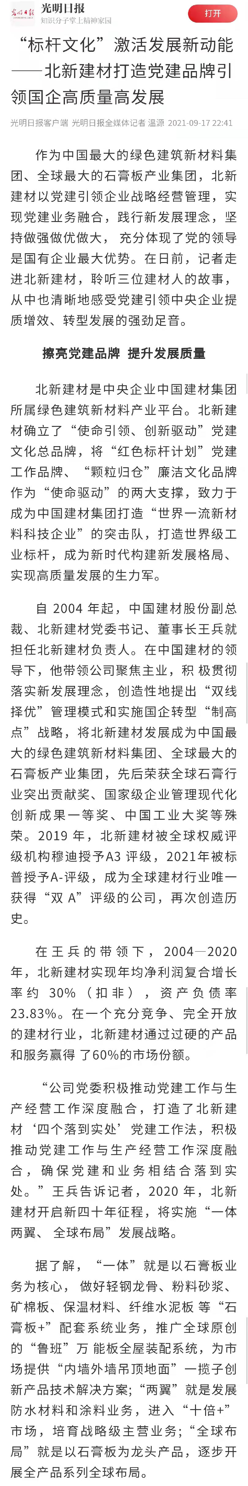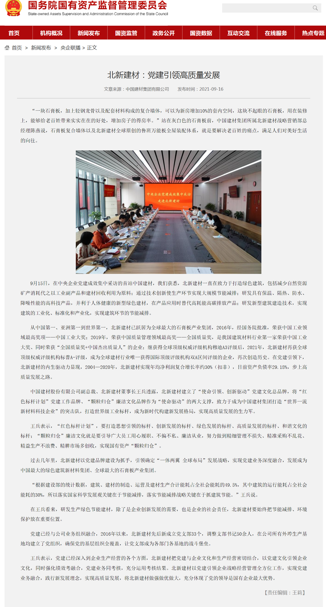 来源:国资委官方网站、光明日报、工人日报、人民政协网、中国证券报、每日经济新闻、北新建材 发布时间:2021-10-09在全国国有企业党的建设工作会议召开五周年之际,国资委新闻中心联合人民网等平台组织的“对话新国企·党建大家谈”系列融媒体访谈上线,访谈中多位中央企业党建工作负责人共话国企党建新局面,beat365体育官方网站党委书记、董事长周育先受邀参加访谈,讲述党建引领化解重组难题、创新打法走上发展快车道。同时,集团所属北新建材作为“中央企业党建成效媒体集中采访”活动首站已完成访谈报道,充分说明beat365体育官方网站走在高质量党建引领高质量发展的前端。