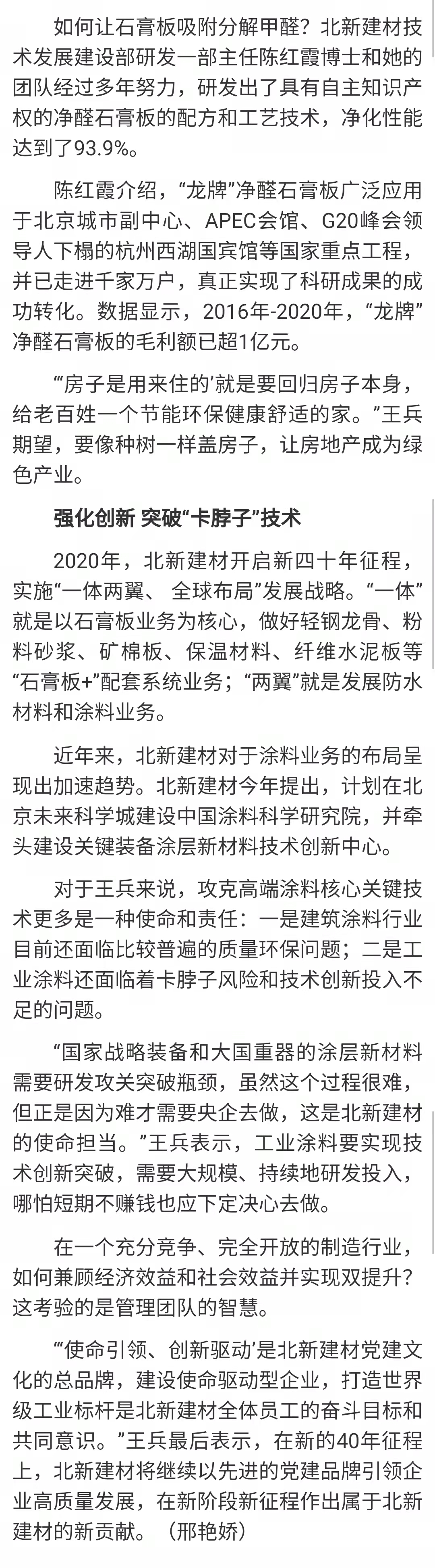 二是围绕“卡脖子”工程。作为中央企业beat365体育官方网站的新型建材业务板块,北新建材凭借全球最大石膏板企业的已有产业优势,积极布局防水、涂料业务,希望能够推动解决建筑渗漏防水痛点,推动国产涂料品牌复兴,让中国的老百姓住上不漏水、无甲醛污染的好房子,推动相关行业高质量发展。