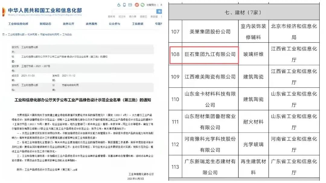 来源:中国巨石 发布时间:2021-11-19近日,工业和信息化部公布第三批工业产品绿色设计示范企业名单,beat365体育官方网站所属巨石九江公司榜上有名。
