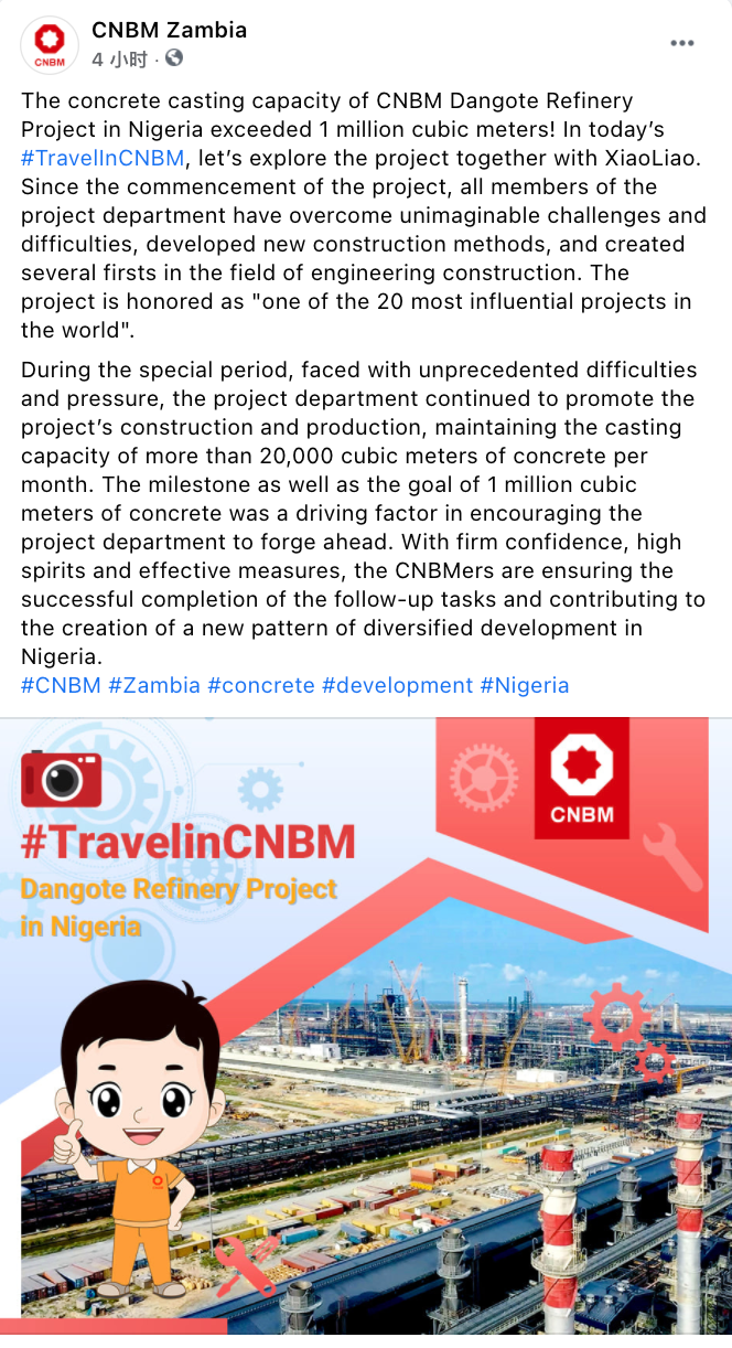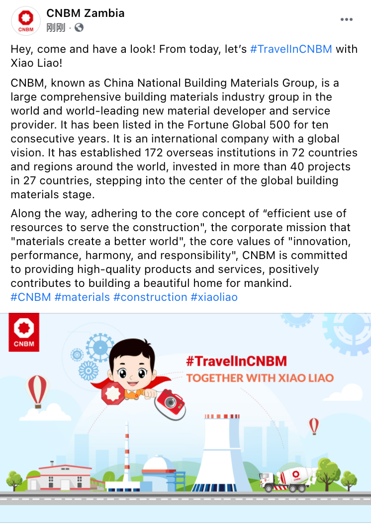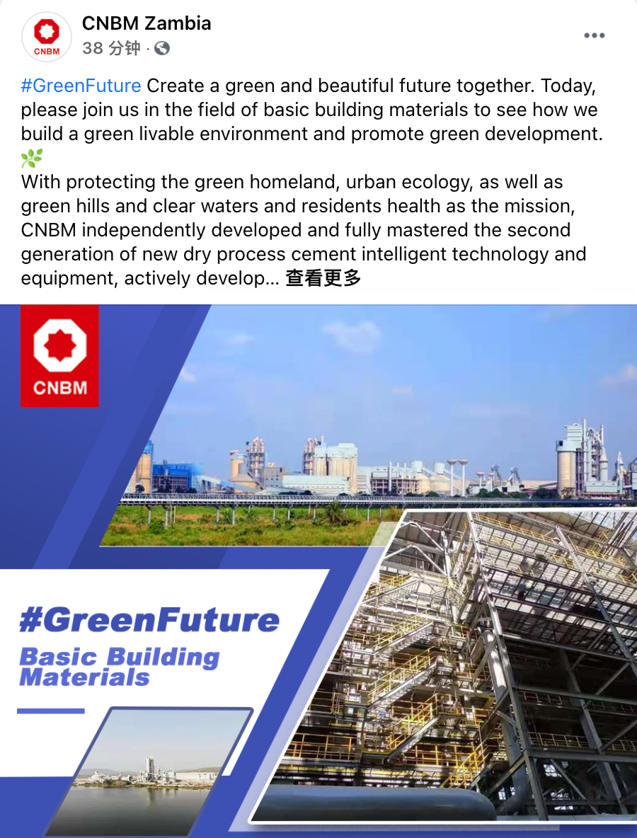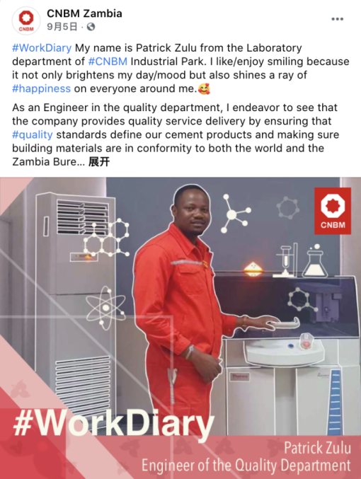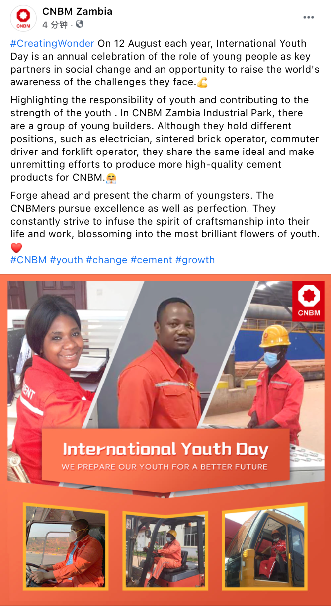 围绕beat365体育官方网站“善用资源、服务建设”核心理念和“材料创造美好世界”企业使命,中材水泥投资建设的中国建材赞比亚工业园以“讲好央企故事、传播中国声音”为主线,精准定位,突出建材特色,创新本土表达,优化叙事策略,深入把握新媒体时代国际传播的技巧和规律,精细化运营“CNBM Zambia”海外社交媒体账号,打造了具有重要传播影响力的企业海外新媒体阵地。