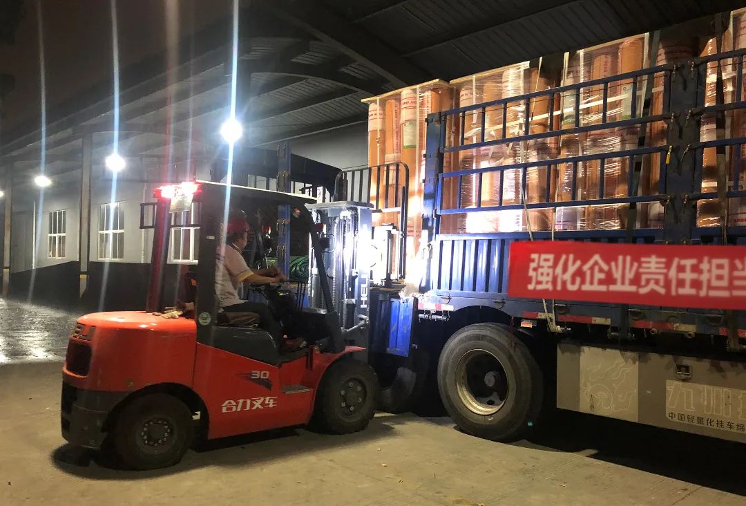 连日来,生产车间内机械轰鸣声不绝于耳,一卷卷高品质的抗菌医用净化地板,源源不断运至仓库,一辆辆大货车停在工厂门口,进行车辆消杀,等待第一时间装货发车。