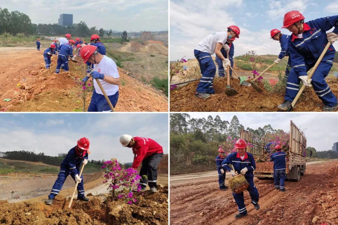 在植树现场,大家铆足干劲,挥锹铲土、培土围堰、提水浇灌,每道工序都有条不紊,每个环节都配合默契。汗水浇灌着泥土,笑脸映衬着山川,大家齐心协力,为矿山披上绿衣。