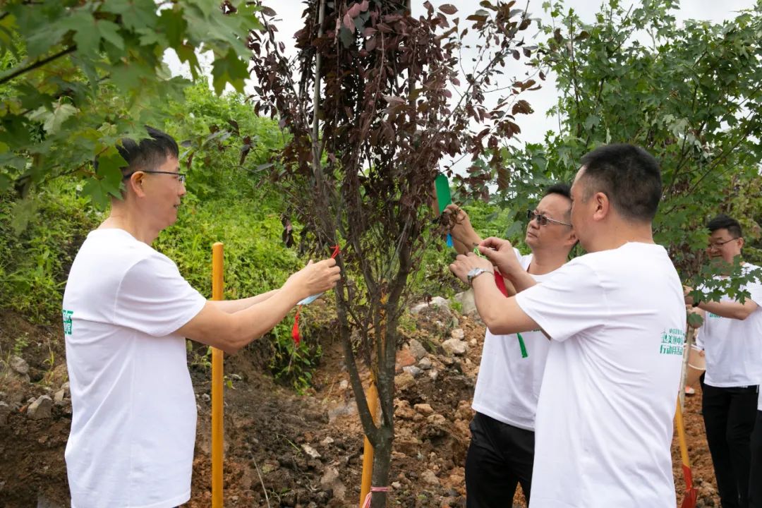 在植树现场,大家干劲十足,以饱满的热情共植黔南州州树——枫香树,搬苗提水、挥锹铲土、填树入坑,共建低碳项目,共享"绿色银行",添彩美丽中国。