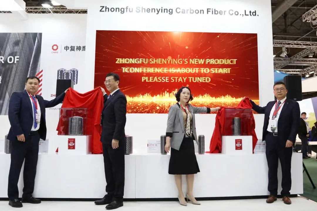 展会首日,中复神鹰现场举行了新品发布会,携新品SYT55S-24K、SYT45S-48K正式亮相,成为展会焦点。中国建材股份副总裁、中国复材党委书记、董事长薛忠民,中复神鹰总经理刘芳、副总经理李韦、副总经理陈秋飞等出席发布会。