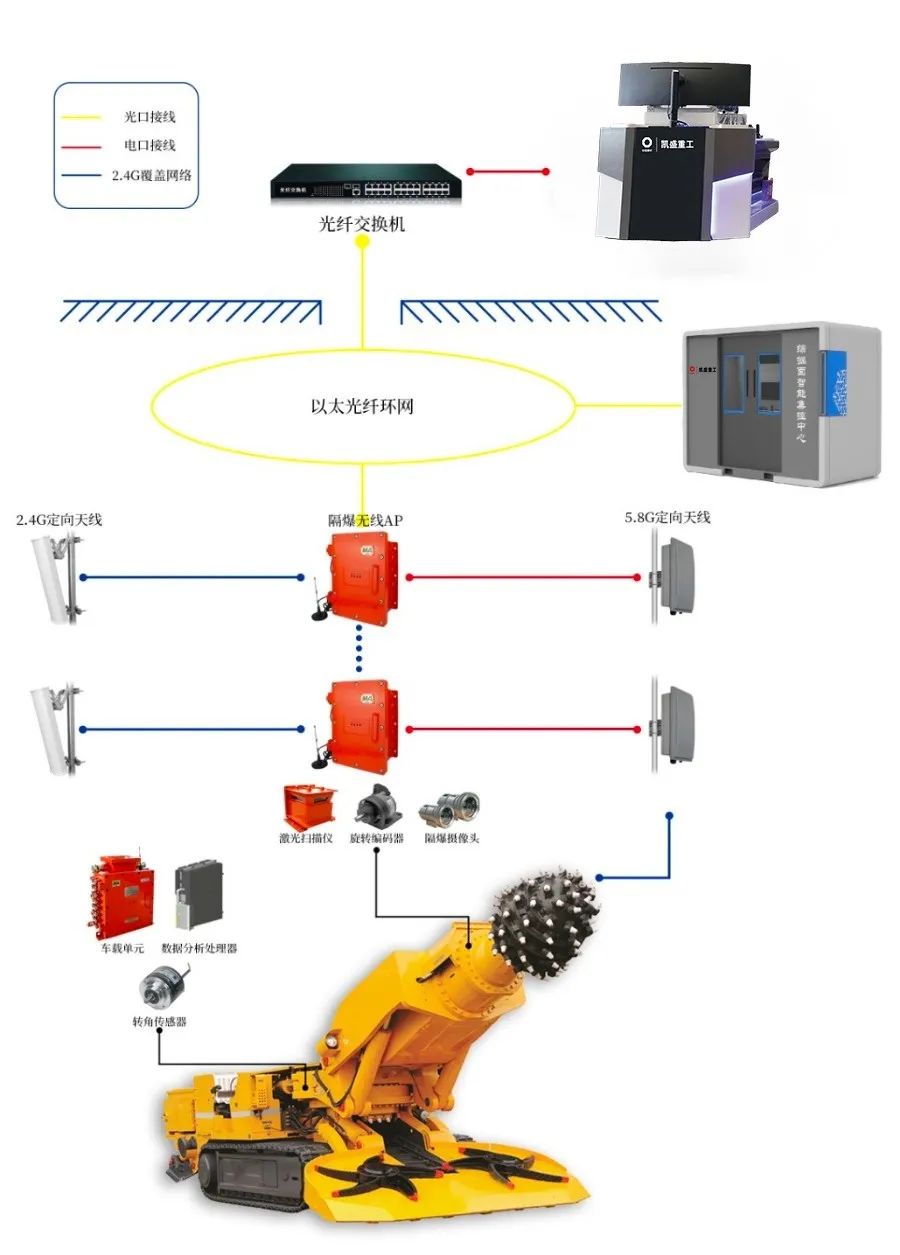 智能化远程控制掘进机多用于煤矿综掘领域,由切割机构、装运机构、行走机构、液压机构、电控系统、水系统等组成。工作人员可以在离工作面较远处的安全区域,通过可视化技术,全方位监测掘进工作的场景,进行超视距控制截割作业,可有效提高掘进效率和安全系数。
