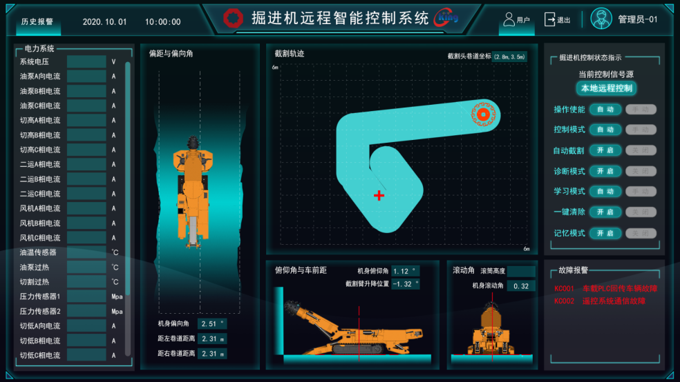 采用激光雷达+惯性导航系统+位移传感器+定位传感器的多传感融合方式,通过基于卡尔曼滤波的精准定位算法,对掘进机进行精准定姿定位,定位坐标误差≤5cm,为设备智能化自主作业提供控制依据和控制条件。
