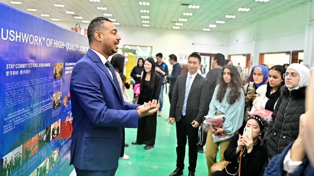 师生们参观了最新的玻璃纤维生产线,现场观看了巨石埃及公司宣传片以及主题为《“丝路”十年 共赢未来》的成果展。他们直观地了解到了玻璃纤维生产的全过程,被中国先进制造业的自动化水平和科技含量所震撼,也了解到了巨石埃及在“一带一路”倡议提出十年来践行社会责任的优秀成果。