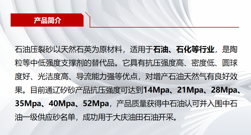 公司保有资源总量超2亿吨,产品种类包括光伏砂、浮法砂、长石、铸造砂、石油压裂砂等,能够满足浮法玻璃、光伏玻璃、器皿玻璃及陶瓷、铸造、钻井等衍生行业生产使用,并对玻璃企业起到保供、降本重要作用。