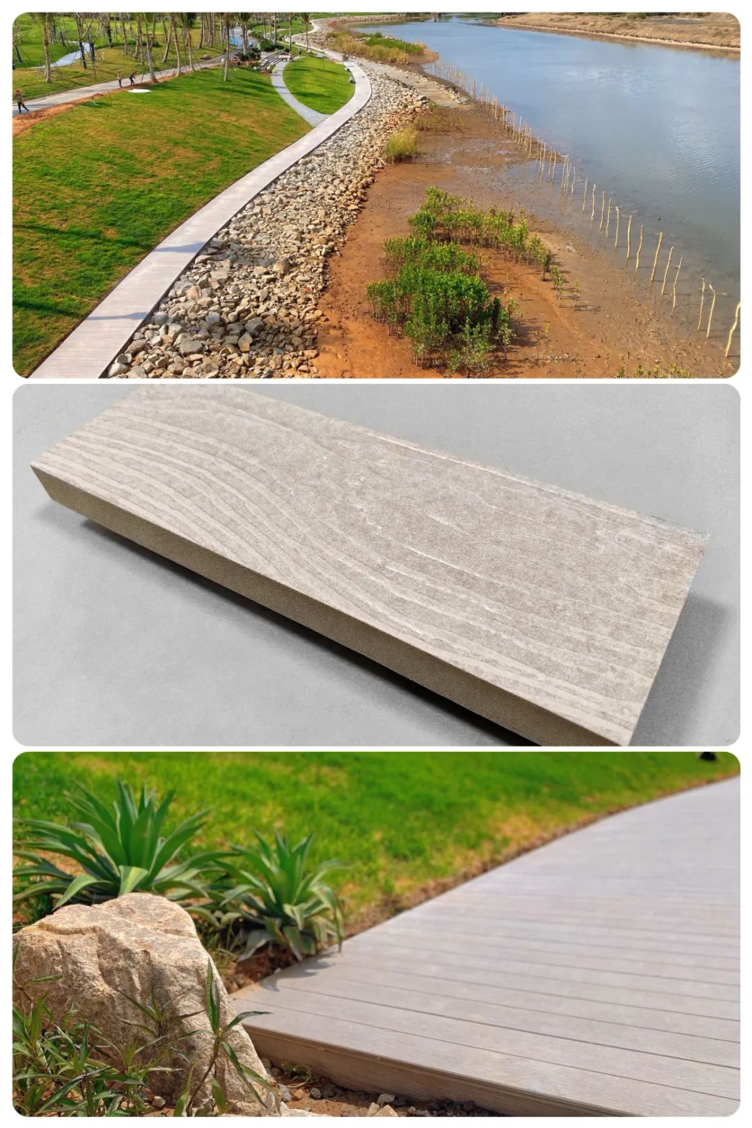 中材汉鲲栈道板是一种表面具有天然雪松纹理,集绿色环保、通体一色、A级防火、防潮防蛀、耐候性强、耐磨防滑、施工便捷、简易维护等优良性能为一体的绿色新型板材;作为木质材料、木塑制品的最佳替代品,具有更好的耐候性、实用性与经济性,已广泛应用于园林景观项目中。