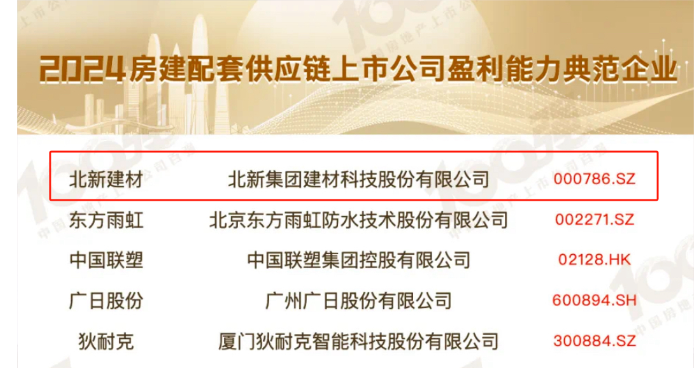 近日,“2024中国房地产及物业上市公司测评成果发布会”在深圳成功举行。北新建材通过优化产品结构,提升服务能力,向制造价值链延展,实现有质量的增长,入选“2024房地产配套供应链上市公司盈利能力典范企业”。