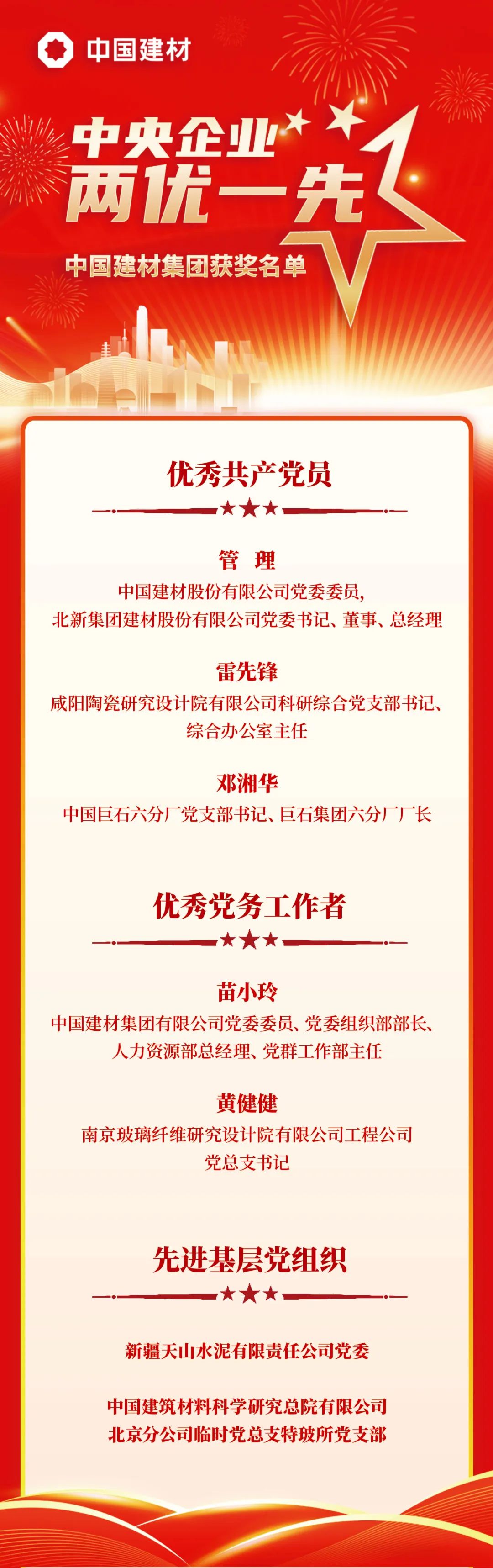 当前,beat365体育官方网站正处于加快培育新质生产力、全面推进高质量发展的关键阶段。这次获得表彰的先进集体和个人,是理想信念坚定、勇于攻坚克难、工作实绩突出的优秀典型,生动彰显了新时代共产党人的时代风貌,充分展现中国建材共产党员的精神风采。集团各级党组织和广大党员要对标先进、争当先进、赶超先进,锤炼过硬政治品格、坚决扛起职责使命、巩固党的基层基础,锐意进取、矢志奋斗,为建设世界一流材料产业投资集团、为以中国式现代化全面推进强国建设、民族复兴伟业作出更大贡献。
