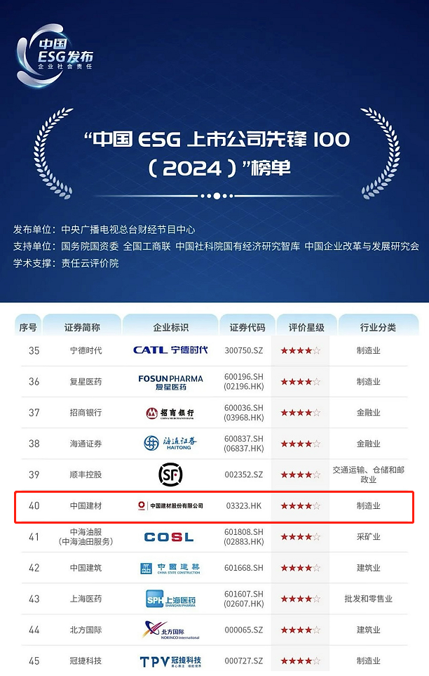 会上正式发布“中国ESG(企业社会责任)《2024年度ESG行动报告》”,报告以A股与港股6,471家上市公司为样本空间,选取972家上市公司作为评价对象,呈现中国企业ESG特征与趋势,编制形成“中国ESG上市公司先锋100(2024)”榜单,并提出推动中国ESG高质量发展的建议。中国建材股份凭借在ESG领域的持续深耕,再次入选“中国ESG上市公司先锋100”榜单,位列第40位。