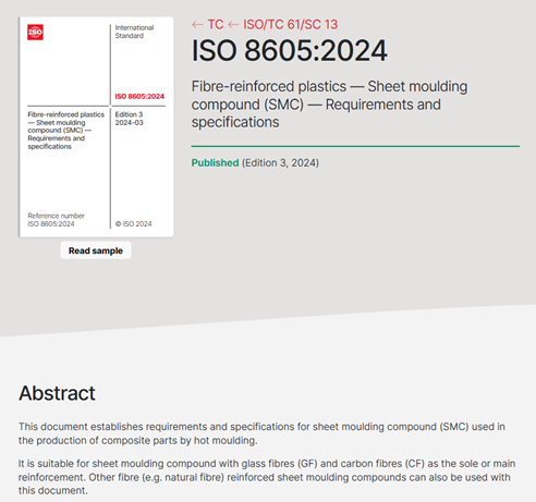近日,国际标准化组织(ISO)正式发布了国际标准ISO 8605:2024《纤维增强塑料——片状模塑料(SMC)——要求和规范》(Fibre-reinforced plastics — Sheet moulding compound (SMC) — Requirements and specifications),该项标准由北京玻钢院复合材料有限公司主导修订。此次修订历时3年,通过对SMC产品的生产和应用进行充分调研,在标准中新增了近年来产量及应用都逐渐增长的碳纤维(包括回收碳纤维)、玄武岩纤维等纤维类型,给出了较恰当的SMC命名规则,增加了SMC收缩代号和必要的SMC测试性能等。该项标准的成功发布,为全球SMC产品的应用及产业的发展提供了技术支撑,带动该项技术走出国门、走向国际,全面展现我国在SMC技术领域发挥的积极作用,为复合材料国际标准化工作贡献了中国智慧。
