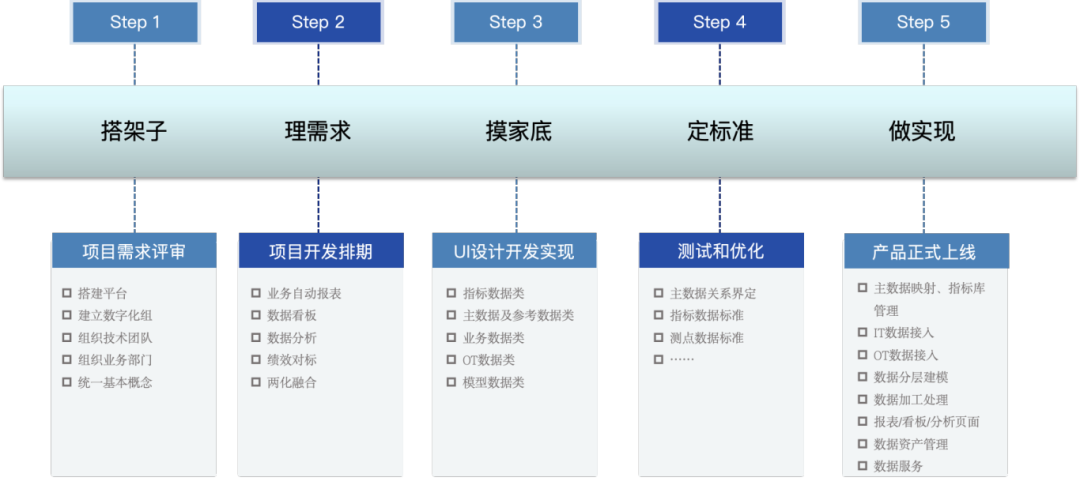 在祁连山水泥的大力支持下,信云智联着眼其数字化需求,按照“自下而上,需求驱动”模式,实现小步快跑。具体方法是,先聚焦到需求最迫切的生产管理领域,以实际需求为导向,再通过“五步走策略”进行数据治理,最终用数据应用实现企业管理需求。