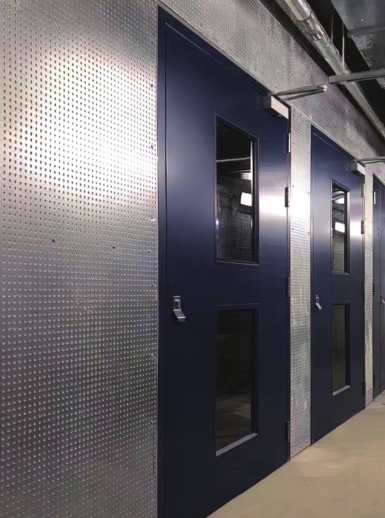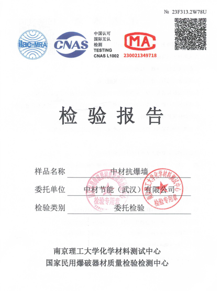 中材汉鲲®抗爆板是由上下两块冲孔的0.5mm厚镀锌钢板强力压挤在8.5mm厚纤维增强水泥板上构成的合成防火板材,已取得国家级检测中心的抗爆性能试验检测报告,抗爆压力值达到4000kPa,远超过国标图集14J938内所规定的抗爆压力值1400kPa。抗爆板与钢龙骨、岩棉组成的抗爆墙大量应用于石油化工、核电、军工、离岸石油平台、电源变压器室、仓库等,与钢筋混凝土抗爆墙相比,具有重量轻、易装易卸可回收再利用等优点。