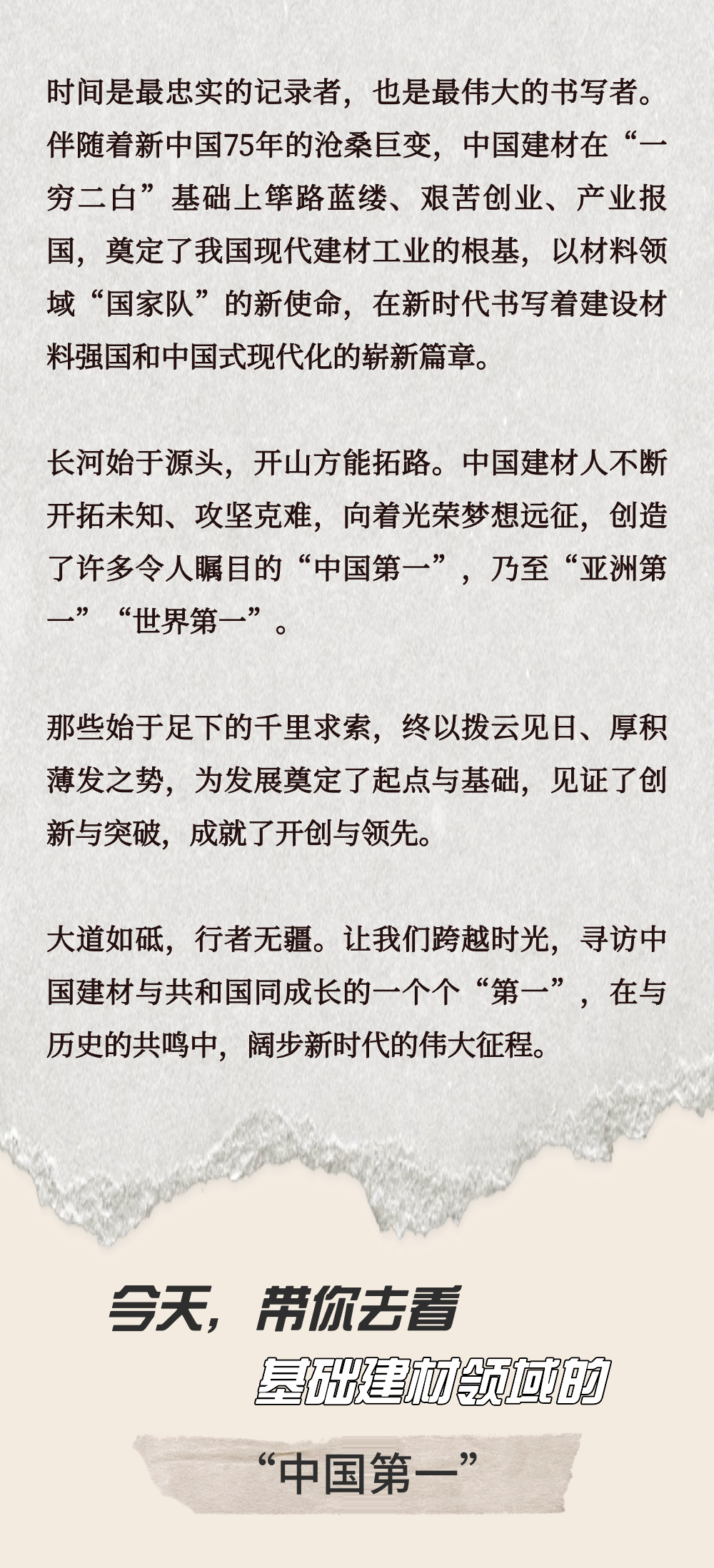 来源:中国建材股份 发布时间:2024-09-20七十五载春秋梦,奋进新程日月长。今年是新中国成立75周年,作为我国建材行业唯一央企,中国建材积极参与国资委《国家工业密码》栏目,与央视联合推出微纪录片《红色丰碑》,组织策划文化心连心巡演、书画作品展等系列活动。我们特开设《致敬75周年》专栏,向大家展示中国建材的新材料、新技术、新成果,展现中国建材人的产业报国、材料强国的家国情怀和使命担当。