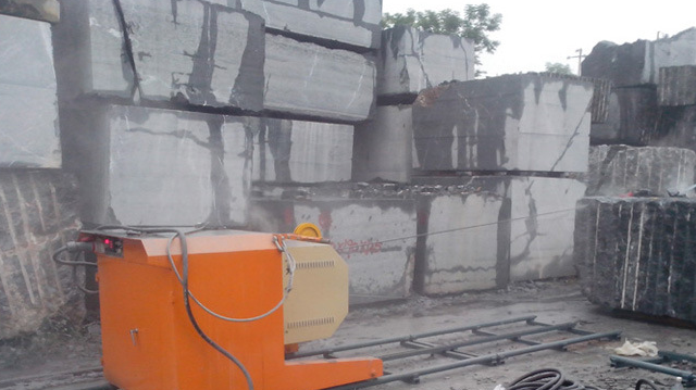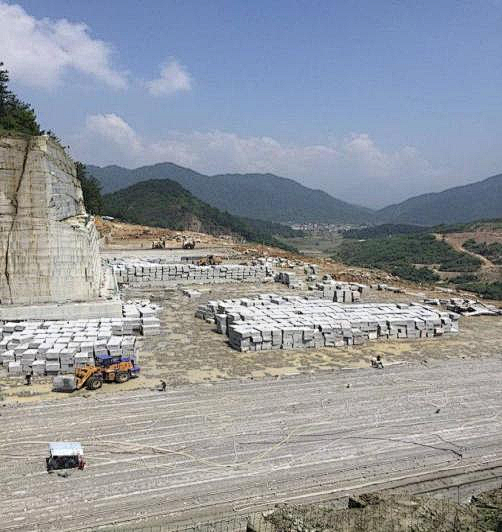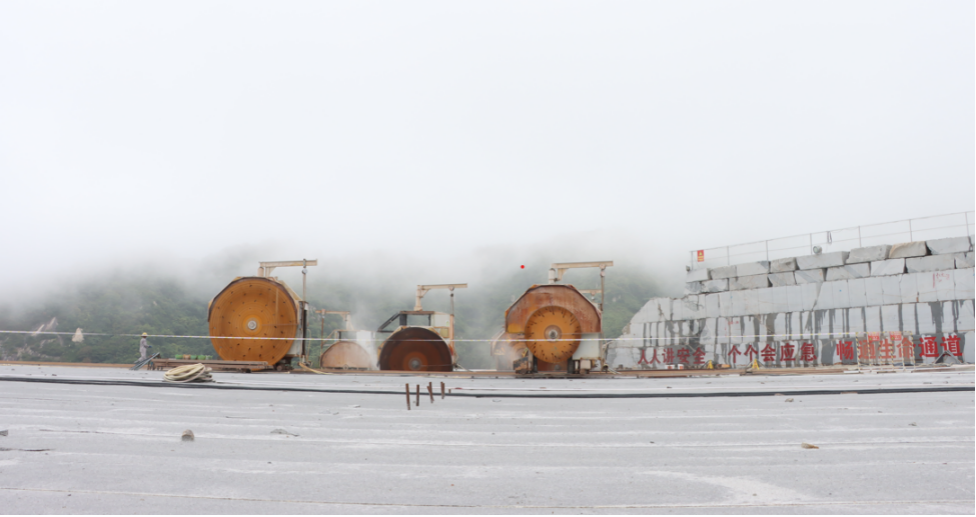 花岗岩荒料的开采方式为露天开采,采用先进的圆盘锯锯切垂直面、绳锯机拖底开采工序。