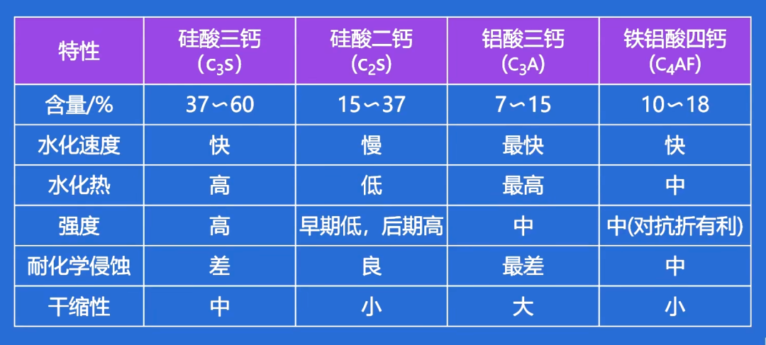 水泥是由水泥熟料掺加混合材料经粉磨后制成的粉状物料。水泥熟料作为其最主要的成分,由硅酸三钙(C3S)、硅酸二钙(C2S)、铝酸三钙(C3A)和铁铝酸四钙(C4AF)四种主要矿物质构成,这四种矿物质被称为水泥熟料的“四大金刚”。“四大金刚”平时的精神状态十分稳定,但遇到水之后,他们可就兴奋起来了,产生一系列的水化反应,这就是水泥硬化的关键所在。