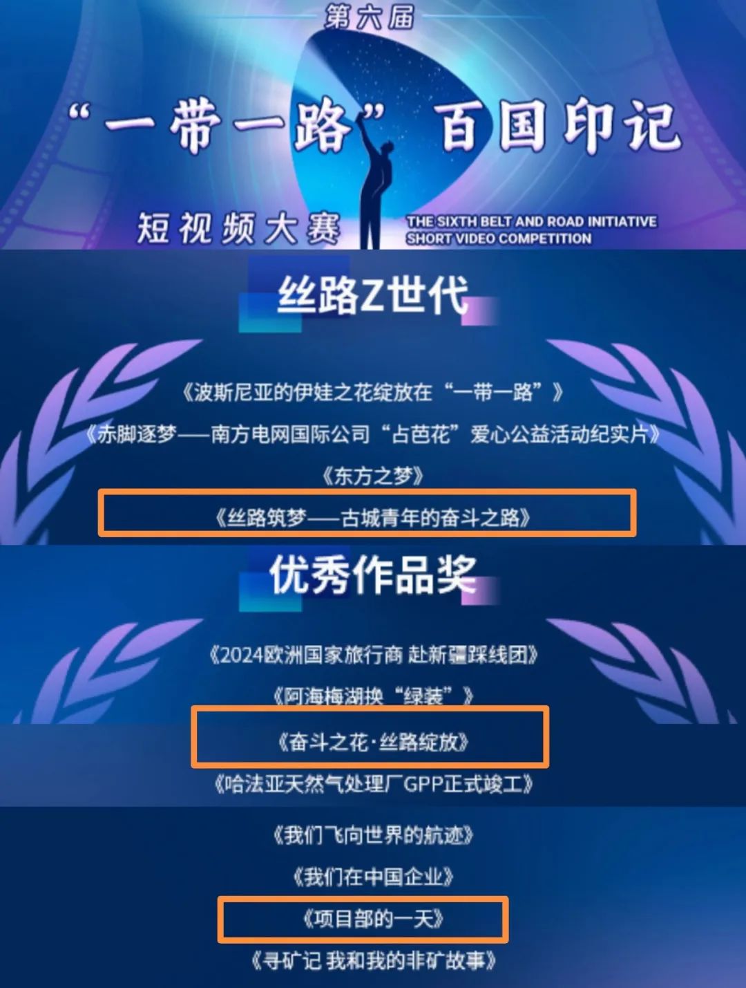近日,“一带一路”百国印记短视频大赛获奖名单正式揭晓,本届大赛以“向新而生,共促繁荣”为主题,由中国公共外交协会主办。beat365体育官方网站申报的北新建材中亚作品《丝路筑梦——古城青年的奋斗之路》入选“丝路Z世代”,中建投巴新作品《奋斗之花·丝路绽放》、中材国际(南京)作品《项目部的一天》获“优秀作品”。自大赛设立以来,集团申报作品已连续6年获奖。