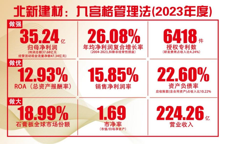 北新集团建材股份有限公司(简称北新建材)践行“绿色科技 品质生活”公司使命,坚守“价本利”经营理念,打造“双增长”模型,产品扮靓天安门城楼,应用于冬奥会、大运会、亚运会等重大工程项目,服务神舟飞船等大国重器,企业核心竞争力不断提升,核心功能不断增强。近年来,公司以“一线状态”全力应对严峻复杂经营环境,坚守“价本利”经营理念,打造“双增长”模型,加快推动“四个转变”,加速向消费类建材制造服务商转型,2024年前三季度,实现收入、利润两位数“双增长”,连续19年年均净利润复合增长率超26%,品牌价值超1185亿元,交出高质量发展优异答卷。