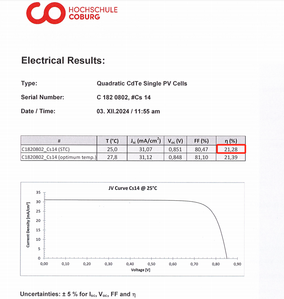 近日,凯盛集团所属德国CTF公司研发的碲化镉发电玻璃电池经德国Hochschule Coburg检测,实验室转化效率达到21.28%,刷新了最新纪录。凯盛集团在国内将 CTF 公司的研发成果成功应用于碲化镉生产转化。截至目前,瑞昌基地、成都基地、邯郸基地的大面积(1.92m2)碲化镉冠军组件先后实现了 17.7%、17.1%、17.26% 的转化效率。这在不断提升发电玻璃核心竞争力的同时,也持续降低了发电玻璃的生产制造成本,进一步提高了凯盛发电玻璃的市场占有率。