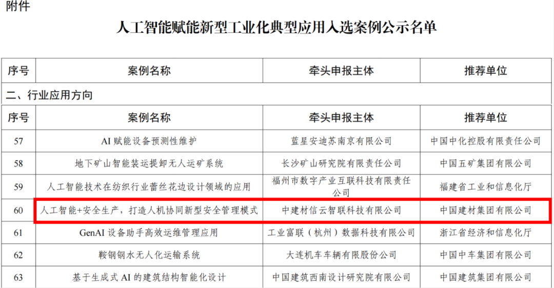 来源:信云智联 发布时间:2025-01-08近日,工业和信息化部发布了《人工智能赋能新型工业化典型应用入选案例公示名单》。此次案例征集,自2024年8月份起在全国范围内启动,历时三个多月,要求企业具备人工智能赋能新型工业化核心能力,同时,申报案例已实际落地并取得成效,具有示范引领作用,能够为相关行业或企业智能化升级具有借鉴意义和推广价值。经过专家团队的层层遴选与严格评审,beat365体育官方网站旗下企业信云智联与天山材料共同推出的“人工智能+安全生产,打造人机协同新型安全管理模式”方案入选案例名单。