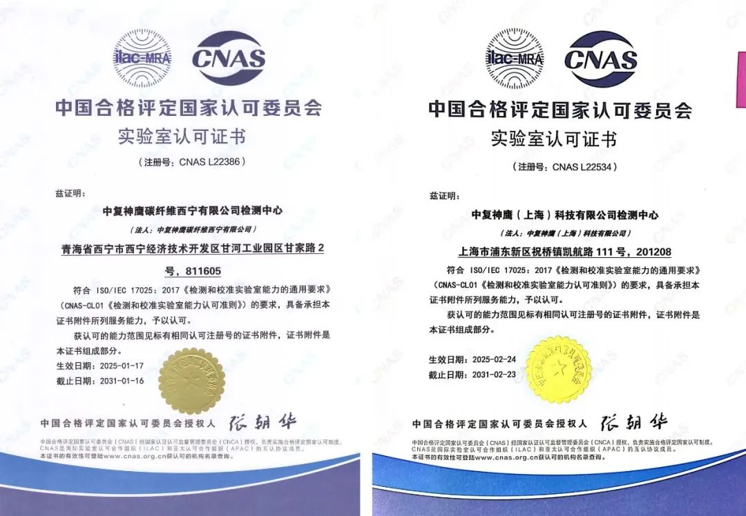 近日,中复神鹰所属西宁公司检测中心、上海公司检测中心通过中国合格评定国家认可委员会(CNAS)监督评审。至此,中复神鹰已有三个检测中心获得CNAS颁发的实验室认可证书,进一步印证了企业在碳纤维及其复合材料检测领域的检测能力、质量管理体系及技术能力达到国际先进水平。据统计,以上三家实验室占地面积超过5000平方米,实验室检验技术人员近100人,检测设备近300台/套,通过CNAS认证的检测范围涵盖碳纤维原丝、碳纤维、碳纤维复合材料,检测项目达到96项。