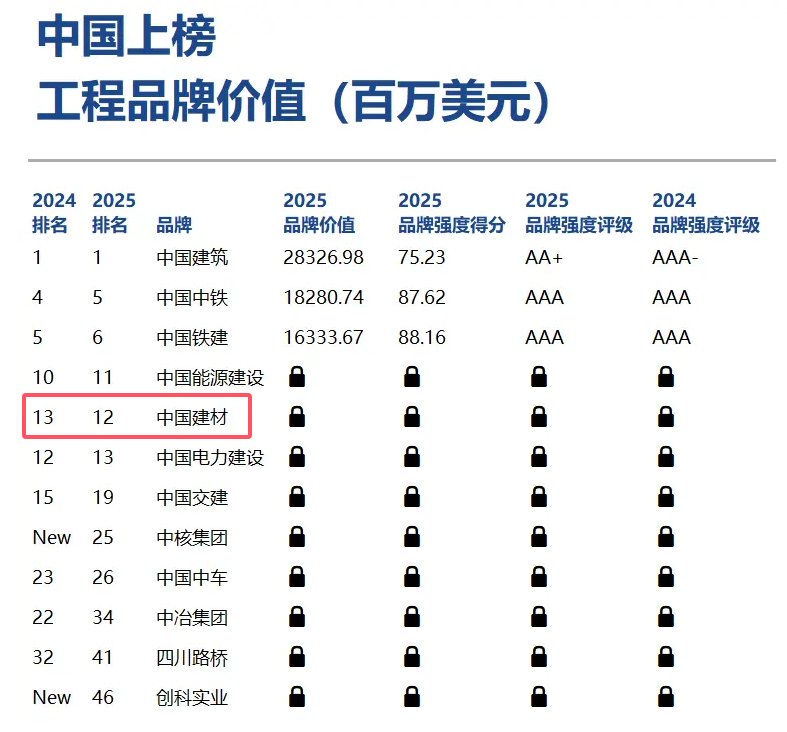 在该榜单中,中国建材的品牌价值逆势增长了0.7%,达到91.1亿美元,排名较2024年上升一位,成为2025年唯一实现排名提升的中国品牌。