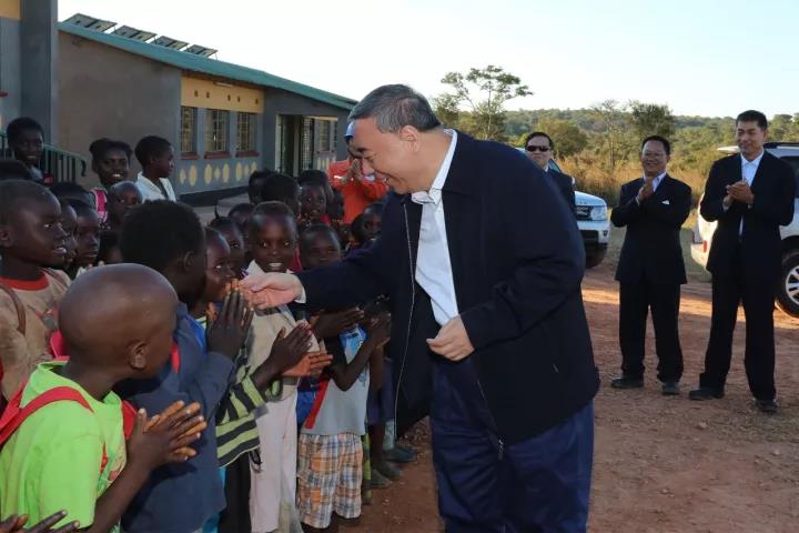 中国建材积极履行世界公民责任,在赞比亚援建了医院和小学。图中是宋志平看望小学老师和学生