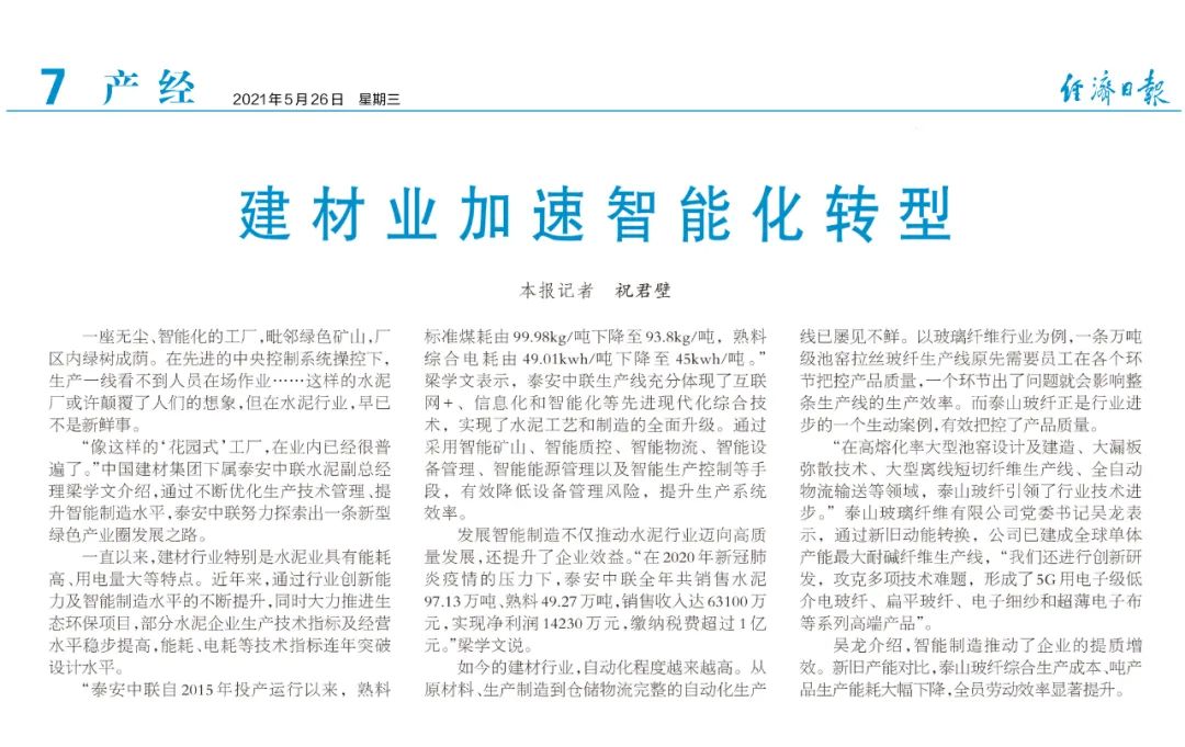 《经济日报》“走进中建材” ,报道建材业加速智能化转型 | 泰安站