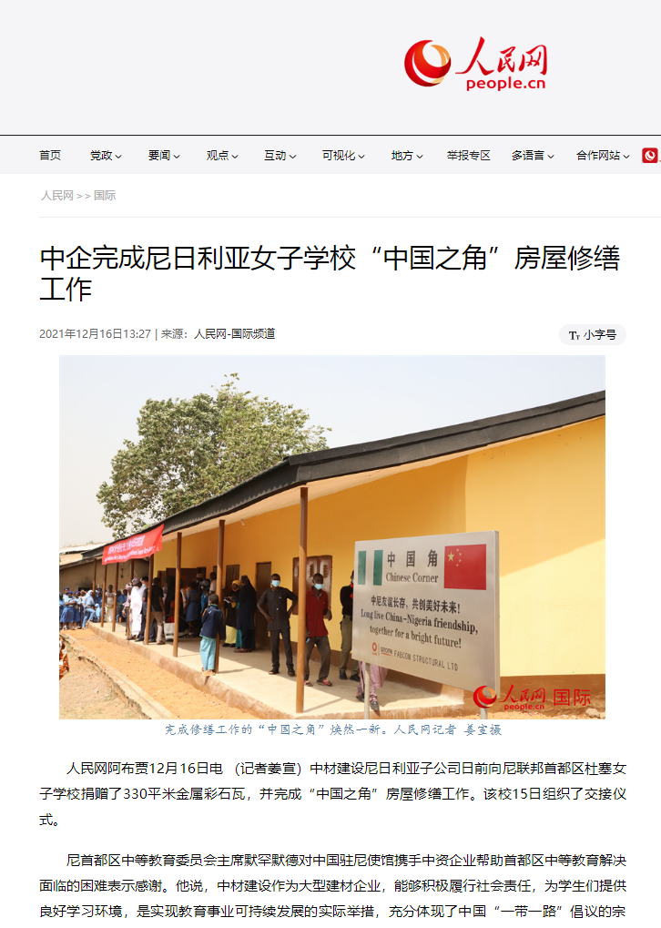 人民网阿布贾12月16日电 (记者姜宣)中材建设尼日利亚子公司日前向尼联邦首都区杜塞女子学校捐赠了330平米金属彩石瓦,并完成“中国之角”房屋修缮工作。该校15日组织了交接仪式。