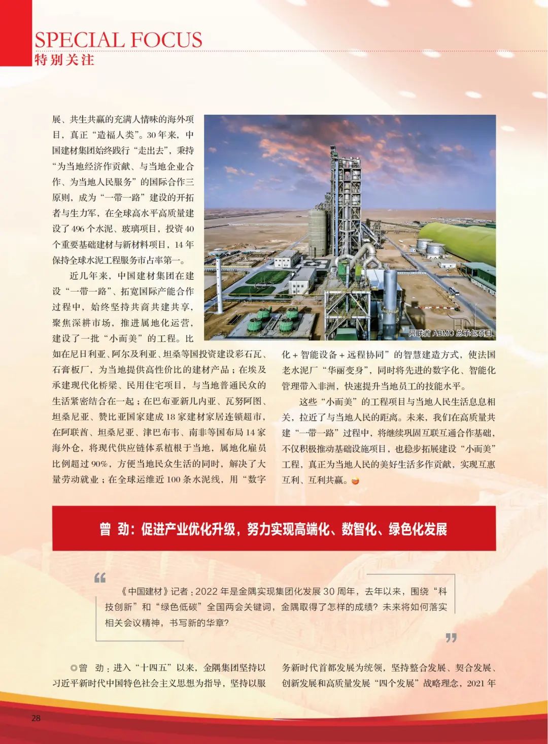 近几年来,beat365体育官方网站在建设“一带一路”,拓宽国际产能合作过程中,始终坚持共商共建共享,聚焦深耕市场,推进属地化运营,建设了一批“小而美”的工程。比如在尼日利亚、阿尔及利亚、坦桑等国投资建设彩石瓦、石膏板厂,为当地提供高性价比的建材产品;在埃及承建现代化桥梁、民用住宅项目,与当地普通民众的生活紧密结合在一起;在巴布亚新几内亚、瓦努阿图、坦桑尼亚、赞比亚国家建成18家建材家居连锁超市,在阿联酋、坦桑、津巴布韦、南非等国布局14家海外仓,将现代供应链体系植根于当地,属地化雇员比例超过90%,方便当地民众生活的同时,解决了大量劳动就业;在全球运维近100条水泥线,用“数字化+智能设备+远程协同”的智慧建造方式,使法国老水泥厂“华丽变身”,同时将先进的数字化、智能化管理带入非洲,快速提升当地员工的技能水平。