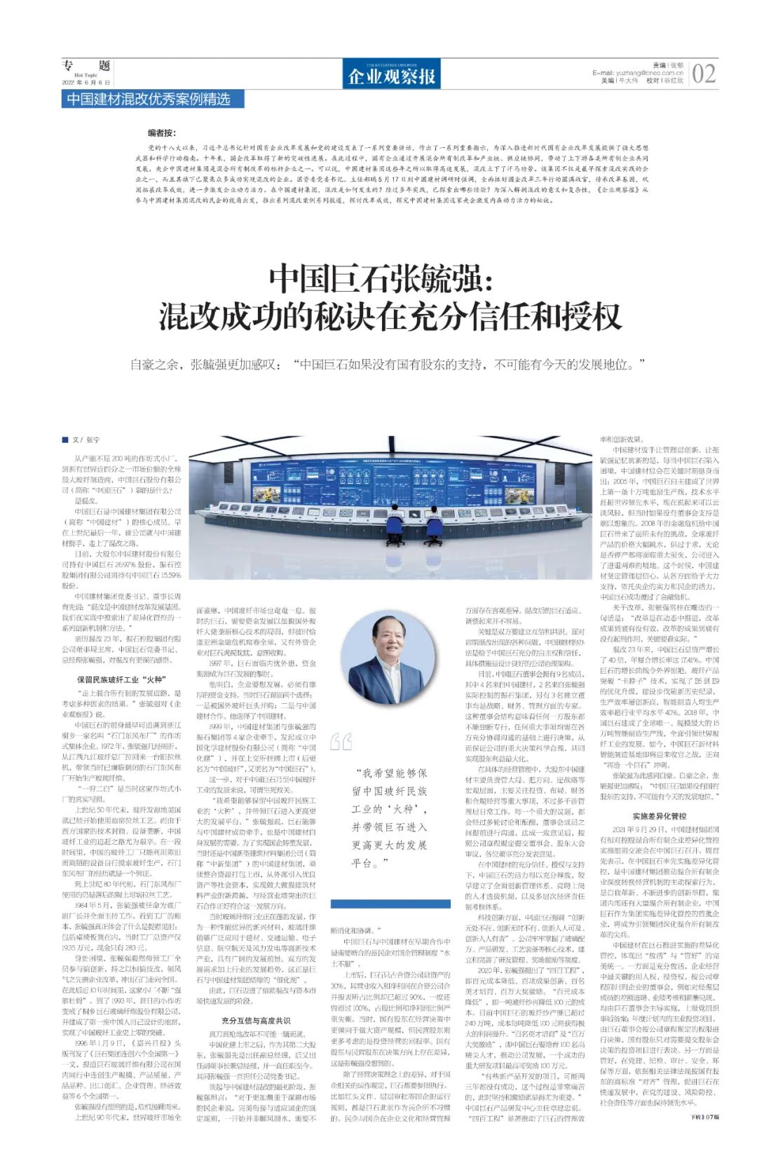beat365体育官方网站党委书记、董事长周育先说:“混改是中国建材改革发展基因。我们在实践中摸索出了差异化管控的一系列创新机制和方法。”